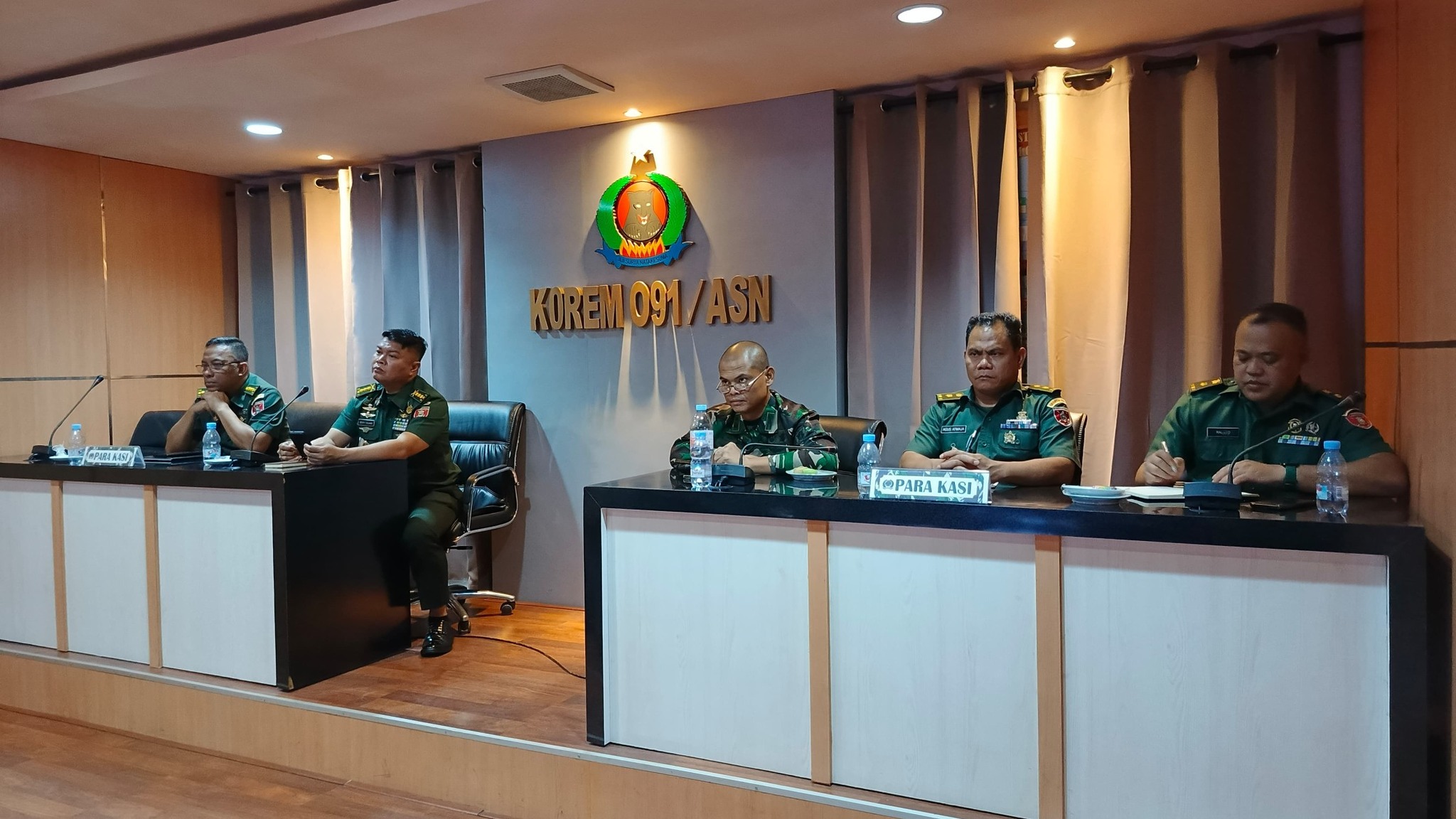 Adapun yang hadir Kasi Intel Kasrem 091/Asn, kolonel Inf Decky Zulhas S.H., Kasiops Kasrem 091/ASN, Letkol Inf Arfan Affandi, S.E., M.Ip, Kasi Log Kasrem 091/ASN Kolonel Czi Benni Setiawan. S.T.,M.Tr (Han), Pasiter Kasrem 091/ASN, Mayor Cpl Agus Admaja, Pasiren Kasrem 091/ASN, Mator Cku Waluyo dan Paku Korem 091/ASN, Kapten Cku Erwanto.
