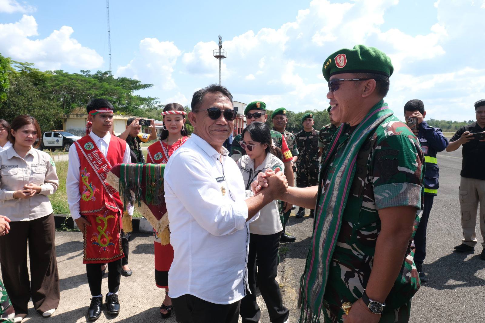 Rombongan Danpusterad di Sambut Oleh H. Nanang Adriani. S. PKP., M.Si. (Wakil Bupati Kab. Kubar), Letkol Inf Doni Fransisco,S. Sos.,M.Han. (Dandim 0912/Kbr), Letkol Inf Syarifuddin Sinaga (Danyon TP 827/Mcy), AKBP Boney Wahyu.W.(Kapolres Kutai Barat), Kapten CPM Salmon (Dansup POM Kubar), Lettu Inf Masrianto (Mewakili Danbrigif), Letda Inf Melky (Pasi Pers Yonif TP 827/Mcy), Kapten Inf Lilik (Danramil 0913-12 Melak), Lettu Arm Dr., Nedi, S.H., M.,Hum (Pasi Intel Kodim 0912/Kbr), Lettu Arm Oktario Sirait, SH (Pasi Op Kodim 0912/Kbr), Letda Lek Rahmadi (Perwakilan Angkatan Udara Kutai Barat),