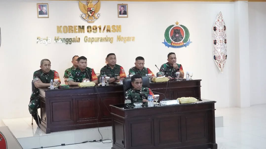 SAMARINDA – -Danrem 091/ASN, Brigjen TNI Anggara Sitompul, S.IP, M.Si beserta jajaran Korem 091/ASN mengikuti Forum Evaluasi Kepala Staf Angkatan Darat (Kasad) Tahun 2024 secara virtual di ruang Yudha Makorem 091/ASN. Selasa (24/12/2024).