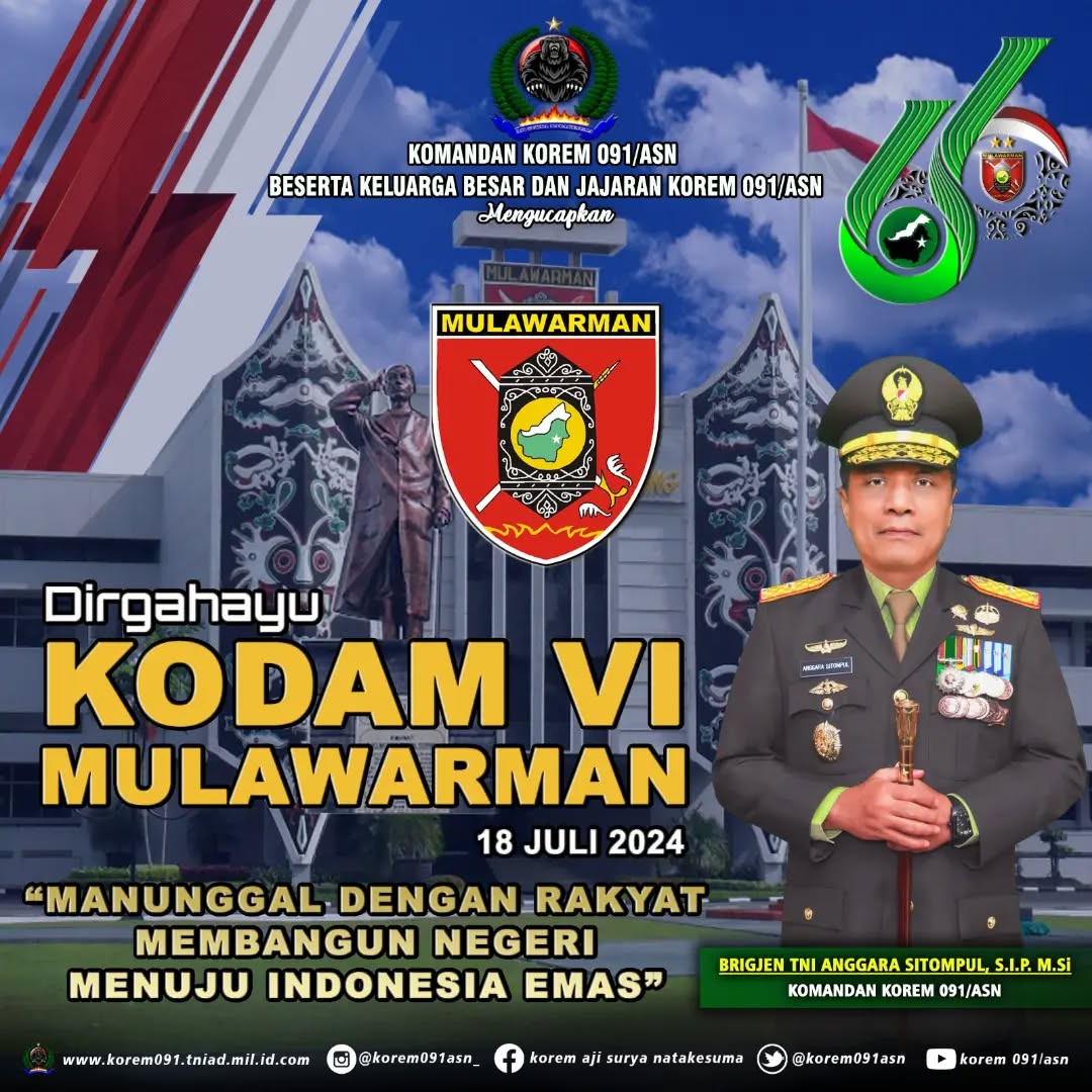 Danrem 091/ASN Beserta Keluarga Besar Korem 091/ASN Mengucapkan Dirgahayu KODAM VI MULAWARMAN 18 Juli 2024 “Manunggal Dengan Rakyat Membangun Negeri Menuju Indonesia Emas”.