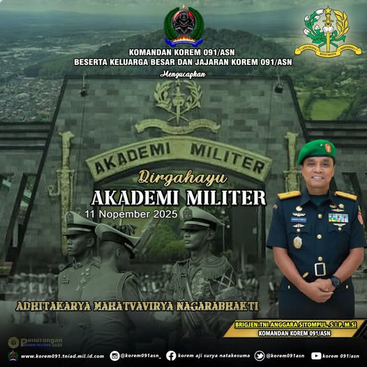 Dirgahayu Akademi Militeradmin09110/01/2026Militer129 Dilihat Komandan Korem 091/ASN dan Beserta Keluarga Besar Korem 091/ASN mengucapkan Dirgahayu Akademi Militer 11 November 2025 . #tni_angkatan_darat #kodam_mlw #tniprima #profesional #responsif #integratif #modern #adaptif #tniadmengabdidanmembangunbersamarakyat #tentararakyat #infokomando #tniad #korem091asn #bersamarakyattnikuat #prajuritmulawarman Post Views: 129 Jangan LewatkanPeringatan Isra Mi’raj, Membentuk Karakter Prajurit yang Prima Guna Menuju Indonesia MajuJaksa Agung RI Kunjungi Kalimantan Timur, Disambut Pangdam VI/Mlw dan Danrem 091/ASNPerkuat Konsolidasi, Danrem 091/ASN Apresiasi Semangat Juang Veteran pada HUT ke-69 LVRI KaltimDipimpin Wapang TNI, Danrem 091/ASN Hadiri Vidcon Evaluasi Pembangunan KDKMPWakasad Pimpin Taklimat Awal Penyampaian Program Kerja dan Anggaran (Progjagar) TA 2026Mempererat sinergi dan koordinasi terkait stabilitas ekonomi dan pembangunan daerah, Kepala Perwakilan BI Silaturahmi ke Danrem 091/ASNUpacara Bulanan 17 Januari 2026 dan Pelepasan Purnawirawan Prajurit Korem 091/ASNSelamat memperingati Isra Mi’raj 1447 H/2026 MPelantikan Rektor Untag Samarinda 2026–2029, Danrem 091/ASN Ucapkan SelamatMenteri Pertahanan RI Kunjungi Brigif TP 85/BTC di Kutai BaratDirgahayu PENERANGAN TNI ANGKATAN DARATUpacara Bendera Mingguan Momentum bagi Prajurit Korem 091/ASN untuk Meningkatkan KedisiplinanPrajurit Korem 091/ASN dan Persit Ikuti Nobar Podcast KartikaDanrem 091/ASN Pimpin Apel Gelar Pasukan dalam Rangka Pengamanan VVIP Kunjungan RI 1HUT ke-69 Provinsi Kalimantan Timur, Danrem 091/ASN : Semoga Kaltim menjadi wilayah yang damai, tangguh menghadapi tantangan dan sukses menuju Indonesia Emas 2045Dirgahayu PROVINSI KALIMANTAN TIMURDirgahayu PUSINTELAD Pusat Intelijen TNI Angkatan DaratDirgahayu DISLITBANG TNI ANGKATAN DARATDirgahayu SECAPA ADPanen Raya dan Pengumuman Swasembada Pangan bersama Presiden RI menjadi penanda penting keberhasilan pertanian Indonesia.Awal Tahun 2026, Korem 091/ASN Gelar Upacara Bendera Penuh KhidmatRakerprov, KONI Kaltim Evaluasi Kinerja 2025Memperingati Hari Amal Bakti ke-80 Kementerian Agama RI Kemenag Perkuat SilaturahmiDanrem 091/ASN : Mengapresiasi Peran Wahdah Islamiyah KaltimKorem 091/ASN Gelar Doa Bersama Lintas Agama Sambut Tahun Baru 2026 dan Doakan Korban Bencana AlamKeluarga Besar Korem 091/ASN Sambut Pergantian Tahun Baru 2026 Secara SederhanaDanrem 091/ASN : Apresiasi Atas Upaya Memperkuat Stabilitas Dan Kemandirian Ekonomi Melalui Sektor Syariah.Korem 091/ASN Gelar Doa Bersama Lintas Agama Sambut Tahun Baru 2026 dan Doakan Korban Bencana Alam