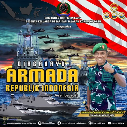 Dirgahayu ARMADA REPUBLIK INDONESIAadmin09114/01/2026Militer181 Dilihat Komandan Korem 091/ASN dan Beserta Keluarga Besar Korem 091/ASN mengucapkan Dirgahayu ARMADA REPUBLIK INDONESIA 5 Desember 2025 . . #tni_angkatan_darat #kodam_mlw #tniprima #profesional #responsif #integratif #modern #adaptif #tniadmengabdidanmembangunbersamarakyat #tentararakyat #infokomando #tniad #korem091asn #bersamarakyattnikuat #prajuritmulawarman Post Views: 181 Jangan LewatkanPeringatan Isra Mi’raj, Membentuk Karakter Prajurit yang Prima Guna Menuju Indonesia MajuJaksa Agung RI Kunjungi Kalimantan Timur, Disambut Pangdam VI/Mlw dan Danrem 091/ASNPerkuat Konsolidasi, Danrem 091/ASN Apresiasi Semangat Juang Veteran pada HUT ke-69 LVRI KaltimDipimpin Wapang TNI, Danrem 091/ASN Hadiri Vidcon Evaluasi Pembangunan KDKMPWakasad Pimpin Taklimat Awal Penyampaian Program Kerja dan Anggaran (Progjagar) TA 2026Mempererat sinergi dan koordinasi terkait stabilitas ekonomi dan pembangunan daerah, Kepala Perwakilan BI Silaturahmi ke Danrem 091/ASNUpacara Bulanan 17 Januari 2026 dan Pelepasan Purnawirawan Prajurit Korem 091/ASNSelamat memperingati Isra Mi’raj 1447 H/2026 MPelantikan Rektor Untag Samarinda 2026–2029, Danrem 091/ASN Ucapkan SelamatMenteri Pertahanan RI Kunjungi Brigif TP 85/BTC di Kutai BaratDirgahayu PENERANGAN TNI ANGKATAN DARATUpacara Bendera Mingguan Momentum bagi Prajurit Korem 091/ASN untuk Meningkatkan KedisiplinanPrajurit Korem 091/ASN dan Persit Ikuti Nobar Podcast KartikaDanrem 091/ASN Pimpin Apel Gelar Pasukan dalam Rangka Pengamanan VVIP Kunjungan RI 1HUT ke-69 Provinsi Kalimantan Timur, Danrem 091/ASN : Semoga Kaltim menjadi wilayah yang damai, tangguh menghadapi tantangan dan sukses menuju Indonesia Emas 2045Dirgahayu PROVINSI KALIMANTAN TIMURDirgahayu PUSINTELAD Pusat Intelijen TNI Angkatan DaratDirgahayu DISLITBANG TNI ANGKATAN DARATDirgahayu SECAPA ADPanen Raya dan Pengumuman Swasembada Pangan bersama Presiden RI menjadi penanda penting keberhasilan pertanian Indonesia.Awal Tahun 2026, Korem 091/ASN Gelar Upacara Bendera Penuh KhidmatRakerprov, KONI Kaltim Evaluasi Kinerja 2025Memperingati Hari Amal Bakti ke-80 Kementerian Agama RI Kemenag Perkuat SilaturahmiDanrem 091/ASN : Mengapresiasi Peran Wahdah Islamiyah KaltimKorem 091/ASN Gelar Doa Bersama Lintas Agama Sambut Tahun Baru 2026 dan Doakan Korban Bencana AlamKeluarga Besar Korem 091/ASN Sambut Pergantian Tahun Baru 2026 Secara SederhanaDanrem 091/ASN : Apresiasi Atas Upaya Memperkuat Stabilitas Dan Kemandirian Ekonomi Melalui Sektor Syariah.Korem 091/ASN Gelar Doa Bersama Lintas Agama Sambut Tahun Baru 2026 dan Doakan Korban Bencana Alam