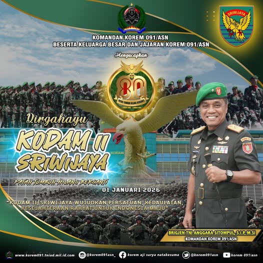 Dirgahayu KODAM II SRIWIJAYAadmin09119/01/2026Militer167 Dilihat Komandan Korem 091/ASN dan Beserta Keluarga Besar Korem 091/ASN mengucapkan Dirgahayu KODAM II SRIWIJAYA 01 Januari 2026 . #TNIAD #KodamVIMulawarman #tni_angkatan_darat #tniprima #profesional #responsif #integratif #modern #adaptif #tniadmengabdidanmembangunbersamarakyat #tentararakyat #infokomando #tniad #korem091asn #bersamarakyattnikuat Post Views: 167 Jangan LewatkanPeringatan Isra Mi’raj, Membentuk Karakter Prajurit yang Prima Guna Menuju Indonesia MajuJaksa Agung RI Kunjungi Kalimantan Timur, Disambut Pangdam VI/Mlw dan Danrem 091/ASNPerkuat Konsolidasi, Danrem 091/ASN Apresiasi Semangat Juang Veteran pada HUT ke-69 LVRI KaltimDipimpin Wapang TNI, Danrem 091/ASN Hadiri Vidcon Evaluasi Pembangunan KDKMPWakasad Pimpin Taklimat Awal Penyampaian Program Kerja dan Anggaran (Progjagar) TA 2026Mempererat sinergi dan koordinasi terkait stabilitas ekonomi dan pembangunan daerah, Kepala Perwakilan BI Silaturahmi ke Danrem 091/ASNUpacara Bulanan 17 Januari 2026 dan Pelepasan Purnawirawan Prajurit Korem 091/ASNSelamat memperingati Isra Mi’raj 1447 H/2026 MPelantikan Rektor Untag Samarinda 2026–2029, Danrem 091/ASN Ucapkan SelamatMenteri Pertahanan RI Kunjungi Brigif TP 85/BTC di Kutai BaratDirgahayu PENERANGAN TNI ANGKATAN DARATUpacara Bendera Mingguan Momentum bagi Prajurit Korem 091/ASN untuk Meningkatkan KedisiplinanPrajurit Korem 091/ASN dan Persit Ikuti Nobar Podcast KartikaDanrem 091/ASN Pimpin Apel Gelar Pasukan dalam Rangka Pengamanan VVIP Kunjungan RI 1HUT ke-69 Provinsi Kalimantan Timur, Danrem 091/ASN : Semoga Kaltim menjadi wilayah yang damai, tangguh menghadapi tantangan dan sukses menuju Indonesia Emas 2045Dirgahayu PROVINSI KALIMANTAN TIMURDirgahayu PUSINTELAD Pusat Intelijen TNI Angkatan DaratDirgahayu DISLITBANG TNI ANGKATAN DARATDirgahayu SECAPA ADPanen Raya dan Pengumuman Swasembada Pangan bersama Presiden RI menjadi penanda penting keberhasilan pertanian Indonesia.Awal Tahun 2026, Korem 091/ASN Gelar Upacara Bendera Penuh KhidmatRakerprov, KONI Kaltim Evaluasi Kinerja 2025Memperingati Hari Amal Bakti ke-80 Kementerian Agama RI Kemenag Perkuat SilaturahmiDanrem 091/ASN : Mengapresiasi Peran Wahdah Islamiyah KaltimKorem 091/ASN Gelar Doa Bersama Lintas Agama Sambut Tahun Baru 2026 dan Doakan Korban Bencana AlamKeluarga Besar Korem 091/ASN Sambut Pergantian Tahun Baru 2026 Secara SederhanaDanrem 091/ASN : Apresiasi Atas Upaya Memperkuat Stabilitas Dan Kemandirian Ekonomi Melalui Sektor Syariah.Korem 091/ASN Gelar Doa Bersama Lintas Agama Sambut Tahun Baru 2026 dan Doakan Korban Bencana Alam