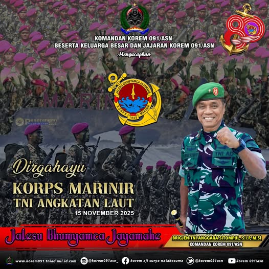 DIRGAHAYU KORP MARINIR TNI ANGKATAN LAUTadmin09110/01/2026Militer257 Dilihat Keluarga Besar Korem 091/ASN Mengucapkan DIRGAHAYU KORP MARINIR TNI ANGKATAN LAUT . #TNIBersamaRakyat #tniprima #profesional #responsif #integratif #modern #adaptif #tniadmengabdidanmembangunbersamarakyat #tentararakyat #infokomando #tniad #korem091asn #korem091 #bersamarakyattnikuat #prajuritmulawarman Post Views: 257 Jangan LewatkanPeringatan Isra Mi’raj, Membentuk Karakter Prajurit yang Prima Guna Menuju Indonesia MajuJaksa Agung RI Kunjungi Kalimantan Timur, Disambut Pangdam VI/Mlw dan Danrem 091/ASNPerkuat Konsolidasi, Danrem 091/ASN Apresiasi Semangat Juang Veteran pada HUT ke-69 LVRI KaltimDipimpin Wapang TNI, Danrem 091/ASN Hadiri Vidcon Evaluasi Pembangunan KDKMPWakasad Pimpin Taklimat Awal Penyampaian Program Kerja dan Anggaran (Progjagar) TA 2026Mempererat sinergi dan koordinasi terkait stabilitas ekonomi dan pembangunan daerah, Kepala Perwakilan BI Silaturahmi ke Danrem 091/ASNUpacara Bulanan 17 Januari 2026 dan Pelepasan Purnawirawan Prajurit Korem 091/ASNSelamat memperingati Isra Mi’raj 1447 H/2026 MPelantikan Rektor Untag Samarinda 2026–2029, Danrem 091/ASN Ucapkan SelamatMenteri Pertahanan RI Kunjungi Brigif TP 85/BTC di Kutai BaratDirgahayu PENERANGAN TNI ANGKATAN DARATUpacara Bendera Mingguan Momentum bagi Prajurit Korem 091/ASN untuk Meningkatkan KedisiplinanPrajurit Korem 091/ASN dan Persit Ikuti Nobar Podcast KartikaDanrem 091/ASN Pimpin Apel Gelar Pasukan dalam Rangka Pengamanan VVIP Kunjungan RI 1HUT ke-69 Provinsi Kalimantan Timur, Danrem 091/ASN : Semoga Kaltim menjadi wilayah yang damai, tangguh menghadapi tantangan dan sukses menuju Indonesia Emas 2045Dirgahayu PROVINSI KALIMANTAN TIMURDirgahayu PUSINTELAD Pusat Intelijen TNI Angkatan DaratDirgahayu DISLITBANG TNI ANGKATAN DARATDirgahayu SECAPA ADPanen Raya dan Pengumuman Swasembada Pangan bersama Presiden RI menjadi penanda penting keberhasilan pertanian Indonesia.Awal Tahun 2026, Korem 091/ASN Gelar Upacara Bendera Penuh KhidmatRakerprov, KONI Kaltim Evaluasi Kinerja 2025Memperingati Hari Amal Bakti ke-80 Kementerian Agama RI Kemenag Perkuat SilaturahmiDanrem 091/ASN : Mengapresiasi Peran Wahdah Islamiyah KaltimKorem 091/ASN Gelar Doa Bersama Lintas Agama Sambut Tahun Baru 2026 dan Doakan Korban Bencana AlamKeluarga Besar Korem 091/ASN Sambut Pergantian Tahun Baru 2026 Secara SederhanaDanrem 091/ASN : Apresiasi Atas Upaya Memperkuat Stabilitas Dan Kemandirian Ekonomi Melalui Sektor Syariah.Korem 091/ASN Gelar Doa Bersama Lintas Agama Sambut Tahun Baru 2026 dan Doakan Korban Bencana Alam