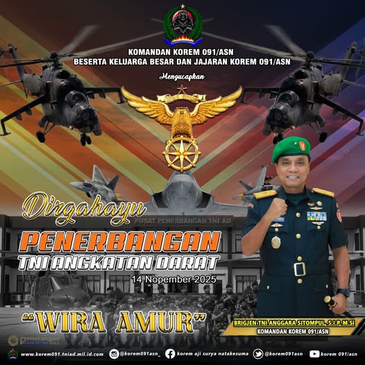 DIRGAHAYU PENERBANGAN TNI AD WIRA AMURadmin09110/01/2026Militer120 Dilihat Keluarga Besar Korem 091/ASN Mengucapkan DIRGAHAYU PENERBANGAN TNI AD WIRA AMUR . . #TNIBersamaRakyat #tniprima #profesional #responsif #integratif #modern #adaptif #tniadmengabdidanmembangunbersamarakyat #tentararakyat #infokomando #tniad #korem091asn #korem091 #bersamarakyattnikuat #prajuritmulawarman Post Views: 120 Jangan LewatkanPeringatan Isra Mi’raj, Membentuk Karakter Prajurit yang Prima Guna Menuju Indonesia MajuJaksa Agung RI Kunjungi Kalimantan Timur, Disambut Pangdam VI/Mlw dan Danrem 091/ASNPerkuat Konsolidasi, Danrem 091/ASN Apresiasi Semangat Juang Veteran pada HUT ke-69 LVRI KaltimDipimpin Wapang TNI, Danrem 091/ASN Hadiri Vidcon Evaluasi Pembangunan KDKMPWakasad Pimpin Taklimat Awal Penyampaian Program Kerja dan Anggaran (Progjagar) TA 2026Mempererat sinergi dan koordinasi terkait stabilitas ekonomi dan pembangunan daerah, Kepala Perwakilan BI Silaturahmi ke Danrem 091/ASNUpacara Bulanan 17 Januari 2026 dan Pelepasan Purnawirawan Prajurit Korem 091/ASNSelamat memperingati Isra Mi’raj 1447 H/2026 MPelantikan Rektor Untag Samarinda 2026–2029, Danrem 091/ASN Ucapkan SelamatMenteri Pertahanan RI Kunjungi Brigif TP 85/BTC di Kutai BaratDirgahayu PENERANGAN TNI ANGKATAN DARATUpacara Bendera Mingguan Momentum bagi Prajurit Korem 091/ASN untuk Meningkatkan KedisiplinanPrajurit Korem 091/ASN dan Persit Ikuti Nobar Podcast KartikaDanrem 091/ASN Pimpin Apel Gelar Pasukan dalam Rangka Pengamanan VVIP Kunjungan RI 1HUT ke-69 Provinsi Kalimantan Timur, Danrem 091/ASN : Semoga Kaltim menjadi wilayah yang damai, tangguh menghadapi tantangan dan sukses menuju Indonesia Emas 2045Dirgahayu PROVINSI KALIMANTAN TIMURDirgahayu PUSINTELAD Pusat Intelijen TNI Angkatan DaratDirgahayu DISLITBANG TNI ANGKATAN DARATDirgahayu SECAPA ADPanen Raya dan Pengumuman Swasembada Pangan bersama Presiden RI menjadi penanda penting keberhasilan pertanian Indonesia.Awal Tahun 2026, Korem 091/ASN Gelar Upacara Bendera Penuh KhidmatRakerprov, KONI Kaltim Evaluasi Kinerja 2025Memperingati Hari Amal Bakti ke-80 Kementerian Agama RI Kemenag Perkuat SilaturahmiDanrem 091/ASN : Mengapresiasi Peran Wahdah Islamiyah KaltimKorem 091/ASN Gelar Doa Bersama Lintas Agama Sambut Tahun Baru 2026 dan Doakan Korban Bencana AlamKeluarga Besar Korem 091/ASN Sambut Pergantian Tahun Baru 2026 Secara SederhanaDanrem 091/ASN : Apresiasi Atas Upaya Memperkuat Stabilitas Dan Kemandirian Ekonomi Melalui Sektor Syariah.Korem 091/ASN Gelar Doa Bersama Lintas Agama Sambut Tahun Baru 2026 dan Doakan Korban Bencana Alam