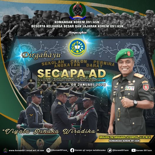 Dirgahayu SECAPA AD(Sekolah Calon Perwita TNI Angkatan Darat)admin09120/01/2026Militer263 Dilihat Komandan Korem 091/ASN dan Beserta Keluarga Besar Korem 091/ASN mengucapkan Dirgahayu SECAPA AD (Sekolah Calon Perwita TNI Angkatan Darat) 8 Januari 2026 . #TNIAD #KodamVIMulawarman #tni_angkatan_darat #tniprima #profesional #responsif #integratif #modern #adaptif #tniadmengabdidanmembangunbersamarakyat #tentararakyat #infokomando #tniad #korem091asn #bersamarakyattnikuat Post Views: 263 Jangan LewatkanPeringatan Isra Mi’raj, Membentuk Karakter Prajurit yang Prima Guna Menuju Indonesia MajuJaksa Agung RI Kunjungi Kalimantan Timur, Disambut Pangdam VI/Mlw dan Danrem 091/ASNPerkuat Konsolidasi, Danrem 091/ASN Apresiasi Semangat Juang Veteran pada HUT ke-69 LVRI KaltimDipimpin Wapang TNI, Danrem 091/ASN Hadiri Vidcon Evaluasi Pembangunan KDKMPWakasad Pimpin Taklimat Awal Penyampaian Program Kerja dan Anggaran (Progjagar) TA 2026Mempererat sinergi dan koordinasi terkait stabilitas ekonomi dan pembangunan daerah, Kepala Perwakilan BI Silaturahmi ke Danrem 091/ASNUpacara Bulanan 17 Januari 2026 dan Pelepasan Purnawirawan Prajurit Korem 091/ASNSelamat memperingati Isra Mi’raj 1447 H/2026 MPelantikan Rektor Untag Samarinda 2026–2029, Danrem 091/ASN Ucapkan SelamatMenteri Pertahanan RI Kunjungi Brigif TP 85/BTC di Kutai BaratDirgahayu PENERANGAN TNI ANGKATAN DARATUpacara Bendera Mingguan Momentum bagi Prajurit Korem 091/ASN untuk Meningkatkan KedisiplinanPrajurit Korem 091/ASN dan Persit Ikuti Nobar Podcast KartikaDanrem 091/ASN Pimpin Apel Gelar Pasukan dalam Rangka Pengamanan VVIP Kunjungan RI 1HUT ke-69 Provinsi Kalimantan Timur, Danrem 091/ASN : Semoga Kaltim menjadi wilayah yang damai, tangguh menghadapi tantangan dan sukses menuju Indonesia Emas 2045Dirgahayu PROVINSI KALIMANTAN TIMURDirgahayu PUSINTELAD Pusat Intelijen TNI Angkatan DaratDirgahayu DISLITBANG TNI ANGKATAN DARATPanen Raya dan Pengumuman Swasembada Pangan bersama Presiden RI menjadi penanda penting keberhasilan pertanian Indonesia.Awal Tahun 2026, Korem 091/ASN Gelar Upacara Bendera Penuh KhidmatRakerprov, KONI Kaltim Evaluasi Kinerja 2025Memperingati Hari Amal Bakti ke-80 Kementerian Agama RI Kemenag Perkuat SilaturahmiDanrem 091/ASN : Mengapresiasi Peran Wahdah Islamiyah KaltimKorem 091/ASN Gelar Doa Bersama Lintas Agama Sambut Tahun Baru 2026 dan Doakan Korban Bencana AlamKeluarga Besar Korem 091/ASN Sambut Pergantian Tahun Baru 2026 Secara SederhanaDanrem 091/ASN : Apresiasi Atas Upaya Memperkuat Stabilitas Dan Kemandirian Ekonomi Melalui Sektor Syariah.Korem 091/ASN Gelar Doa Bersama Lintas Agama Sambut Tahun Baru 2026 dan Doakan Korban Bencana AlamELAMAT TAHUN BARU 2026