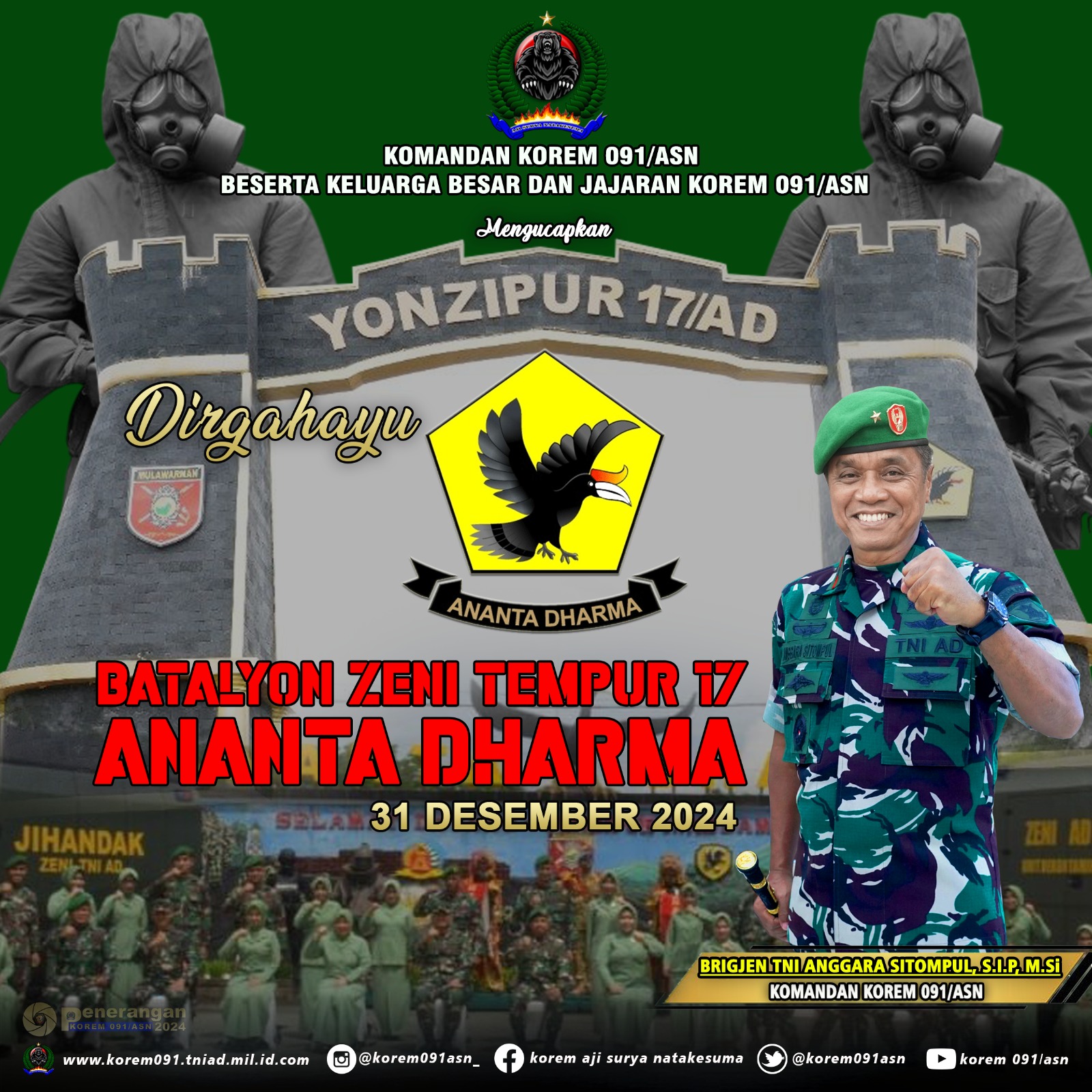 Dirgahayu Yonzeni Tempur 17/Ananta Dharmaredaksi31/12/202408/05/2025PENGUMUMAN76 Dilihat Post Views: 76 Jangan LewatkanDirgahayu Batalyon Infanteri 614 RAJA PANDHITASelamat Hari BhayangkaraUcapan Selamat Tahun Baru Islam 1447 H/2025Dirgahayu Polisi Militer TNI Angkatan DaratDirgahayu Kodam I Bukit BarisanDirgahayu Yonif 621 ManuntungDirgahayu Kodam XIII Merdeka Jaya SaktiUcapan Idul Adha Tahun 2025Dirgahayu Yonif Raider 613 Raja AlamDIRGAHAYU YONIF 611 AWANG LONGDIRGAHAYU KODAM XIV HASANNUDINDIRGAHAYU JASMANI TNI ANGKATAN DARATHARI LAHIR PANCASILA27 MEI 2025 HUT KODAM IX UDYSelamat Hari WaisakSelamat Idul AdhaDirgahayu Brigif 24/Bulungan CaktiDirgahayu BIN RISelamat HardiknasSelamat Hari BuruhDanrem 091/ASN Beserta Keluarga Besar dan Jajaran Korem 091/ASN Mengucapkan Selamat Memperingati Hari KartiniDanrem 091/ASN Beserta Keluarga Besar dan Jajaran Korem 091/ASN Mengucapkan Dirgahayu PussansiadDanrem 091/ASN Beserta Keluarga Besar dan Jajaran Korem 091/ASN Mengucapkan Dirgahayu DisadaadDanrem 091/ASN Beserta Keluarga Besar dan Jajaran Korem 091/ASN Mengucapkan Dirgahayu KOPASSUSDirgahayu KopaskaDirgahayu BekangadDirgahayu Yonif 623/Bhakti Wira UtamaDirgahayu Infolahtad