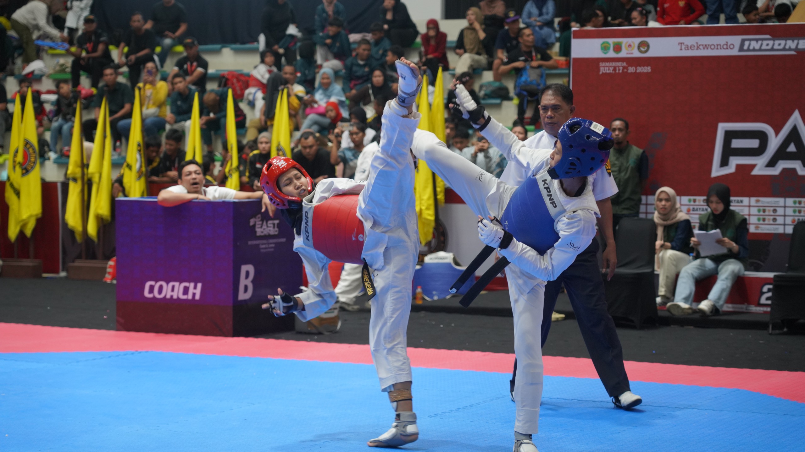 SAMARINDA – Hari ketiga pelaksanaan Turnamen 2nd East Borneo International Taekwondo Championship 2025 yang berlangsung di GOR Segiri Samarinda Kaltim. Sabtu (19/7/2025).