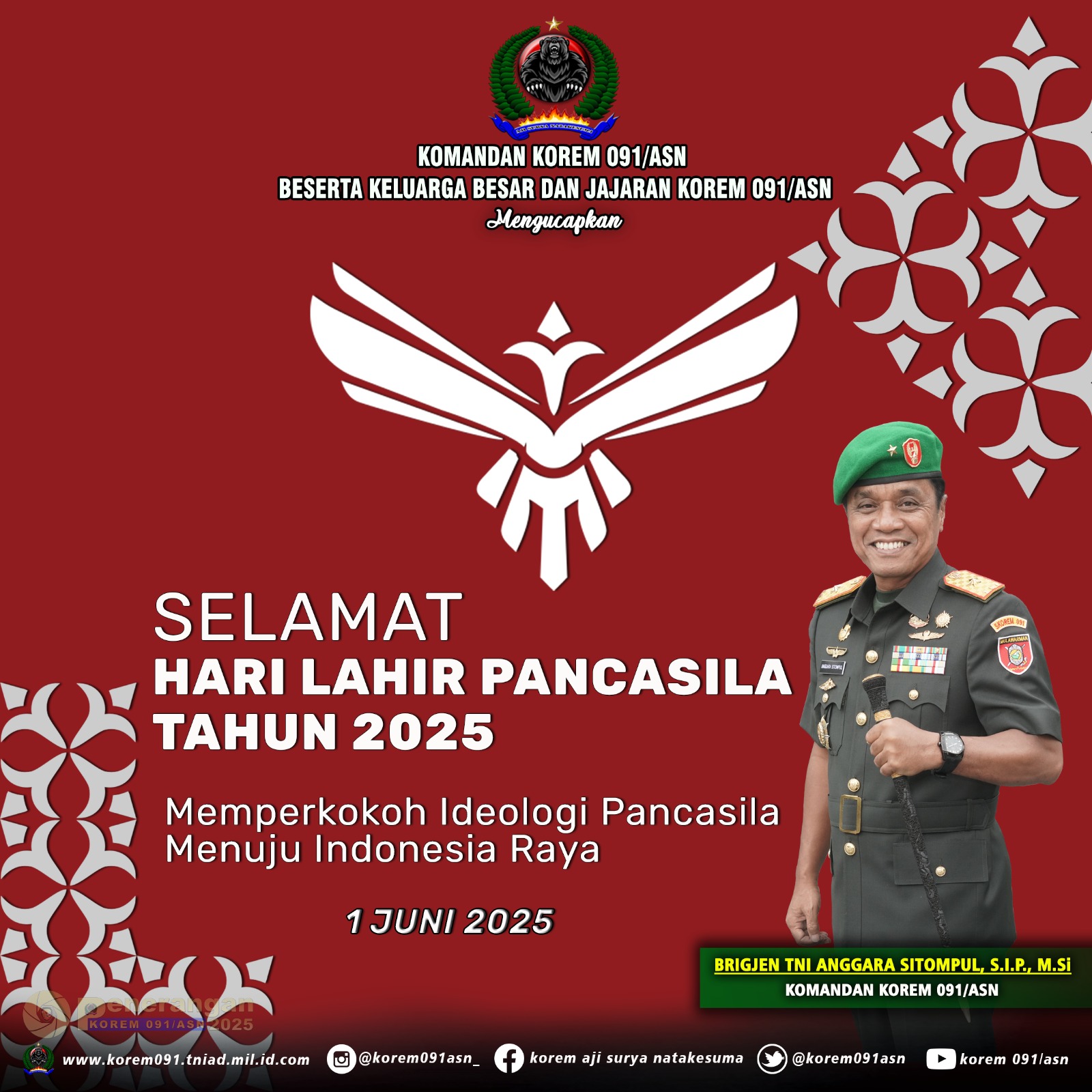 HARI LAHIR PANCASILAredaksi01/06/2025PENGUMUMAN73 Dilihat Post Views: 73 Jangan LewatkanDirgahayu Batalyon Infanteri 614 RAJA PANDHITASelamat Hari BhayangkaraUcapan Selamat Tahun Baru Islam 1447 H/2025Dirgahayu Polisi Militer TNI Angkatan DaratDirgahayu Kodam I Bukit BarisanDirgahayu Yonif 621 ManuntungDirgahayu Kodam XIII Merdeka Jaya SaktiUcapan Idul Adha Tahun 2025Dirgahayu Yonif Raider 613 Raja AlamDIRGAHAYU YONIF 611 AWANG LONGDIRGAHAYU KODAM XIV HASANNUDINDIRGAHAYU JASMANI TNI ANGKATAN DARAT27 MEI 2025 HUT KODAM IX UDYSelamat Hari WaisakSelamat Idul AdhaDirgahayu Brigif 24/Bulungan CaktiDirgahayu BIN RISelamat HardiknasSelamat Hari BuruhDanrem 091/ASN Beserta Keluarga Besar dan Jajaran Korem 091/ASN Mengucapkan Selamat Memperingati Hari KartiniDanrem 091/ASN Beserta Keluarga Besar dan Jajaran Korem 091/ASN Mengucapkan Dirgahayu PussansiadDanrem 091/ASN Beserta Keluarga Besar dan Jajaran Korem 091/ASN Mengucapkan Dirgahayu DisadaadDanrem 091/ASN Beserta Keluarga Besar dan Jajaran Korem 091/ASN Mengucapkan Dirgahayu KOPASSUSDirgahayu KopaskaDirgahayu BekangadDirgahayu Yonif 623/Bhakti Wira UtamaDirgahayu InfolahtadDirgahayu Pusterad