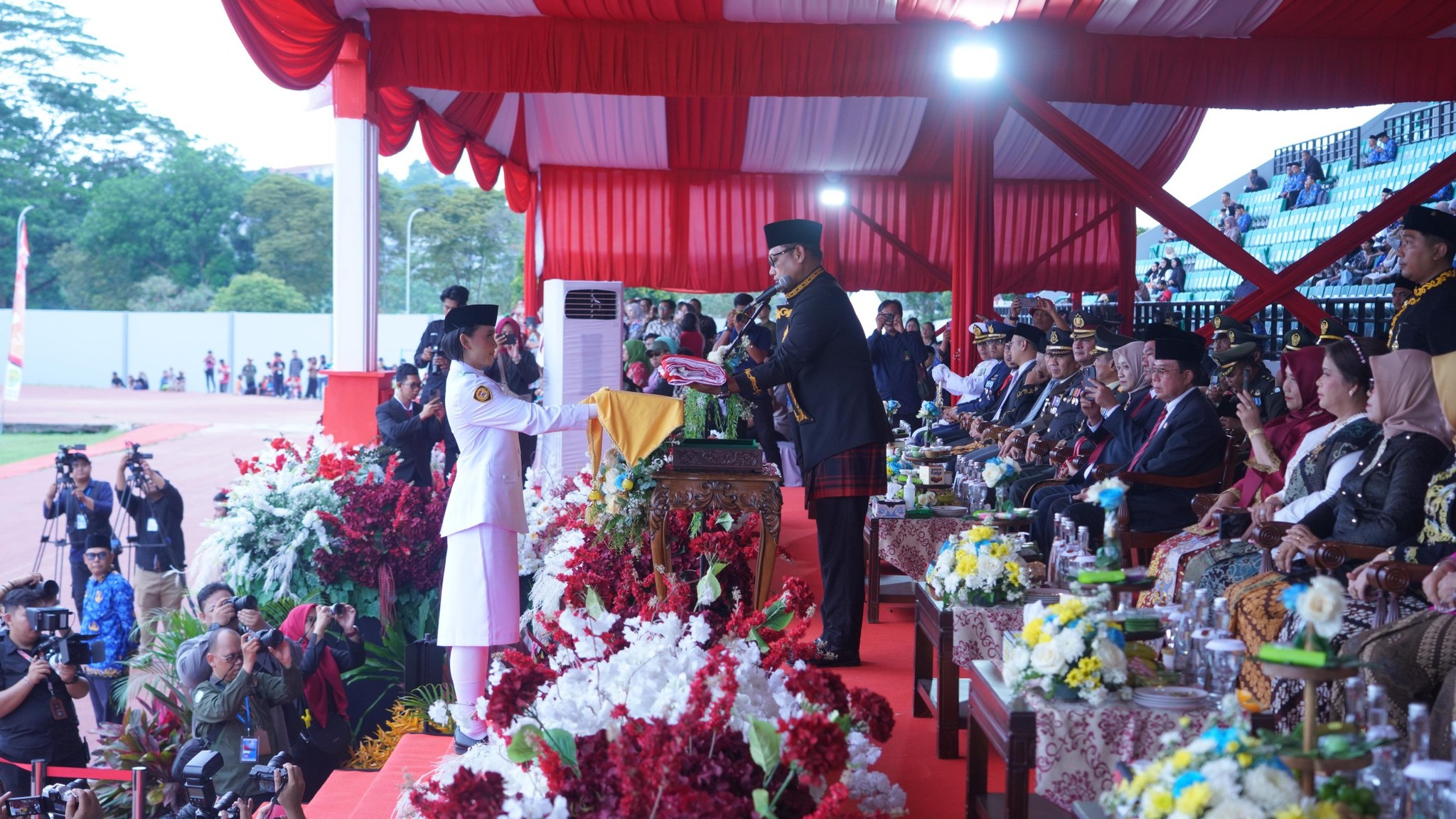 Upacara penurunan tampak khidmat. Wagub Seno pun mengucapkan kembali ke tempat dan bangga saat menerima laporan dari Komandan Paskibraka.“Kembali ke tempat, kami bangga,” ucap Wagub Seno penuh khidmat.