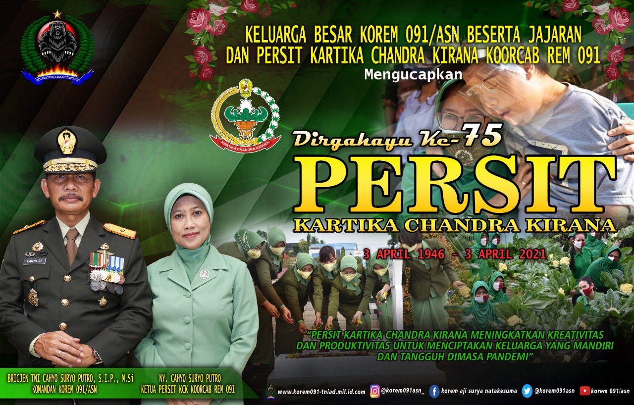 Komandan dan seluruh jajaran Korem 091/ASN beserta Ketua Persit Kartika Chandra Kirana Koorcab Rem 091 mengucapkan Dirgahayu ke-75 tahun Persit Kartika Chandra Kirana