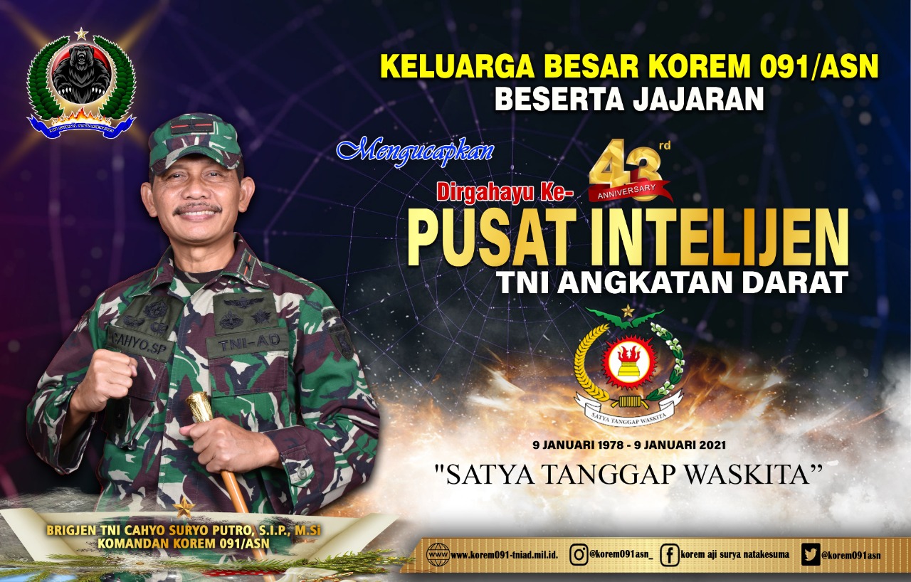 KOMANDAN KOREM 091/ASN BESERTA JAJARAN MENGUCAPKAN DIRGAHAYU KE-43 PUSAT INTELIJEN TNI AD “SATYA TANGGAP WASKITA”09/01/2021PENGUMUMAN84 Dilihat Post Views: 84 Jangan LewatkanDirgahayu Batalyon Infanteri 614 RAJA PANDHITASelamat Hari BhayangkaraUcapan Selamat Tahun Baru Islam 1447 H/2025Dirgahayu Polisi Militer TNI Angkatan DaratDirgahayu Kodam I Bukit BarisanDirgahayu Yonif 621 ManuntungDirgahayu Kodam XIII Merdeka Jaya SaktiUcapan Idul Adha Tahun 2025Dirgahayu Yonif Raider 613 Raja AlamDIRGAHAYU YONIF 611 AWANG LONGDIRGAHAYU KODAM XIV HASANNUDINDIRGAHAYU JASMANI TNI ANGKATAN DARATHARI LAHIR PANCASILA27 MEI 2025 HUT KODAM IX UDYSelamat Hari WaisakSelamat Idul AdhaDirgahayu Brigif 24/Bulungan CaktiDirgahayu BIN RISelamat HardiknasSelamat Hari BuruhDanrem 091/ASN Beserta Keluarga Besar dan Jajaran Korem 091/ASN Mengucapkan Selamat Memperingati Hari KartiniDanrem 091/ASN Beserta Keluarga Besar dan Jajaran Korem 091/ASN Mengucapkan Dirgahayu PussansiadDanrem 091/ASN Beserta Keluarga Besar dan Jajaran Korem 091/ASN Mengucapkan Dirgahayu DisadaadDanrem 091/ASN Beserta Keluarga Besar dan Jajaran Korem 091/ASN Mengucapkan Dirgahayu KOPASSUSDirgahayu KopaskaDirgahayu BekangadDirgahayu Yonif 623/Bhakti Wira UtamaDirgahayu Infolahtad