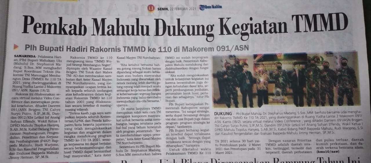 Media Cetak Tribun Kaltim, edisi Senin, 22 Februari 2021, hal 11, Judul Berita Pemkab Mahulu Dukung Kegiatan TMMD23/02/2021Militer239 Dilihat Media Cetak Tribun Kaltim, edisi Senin, 22 Februari 2021, hal 11, Judul Berita Pemkab Mahulu Dukung Kegiatan TMMD Post Views: 239 Jangan LewatkanPeringatan Isra Mi’raj, Membentuk Karakter Prajurit yang Prima Guna Menuju Indonesia MajuJaksa Agung RI Kunjungi Kalimantan Timur, Disambut Pangdam VI/Mlw dan Danrem 091/ASNPerkuat Konsolidasi, Danrem 091/ASN Apresiasi Semangat Juang Veteran pada HUT ke-69 LVRI KaltimDipimpin Wapang TNI, Danrem 091/ASN Hadiri Vidcon Evaluasi Pembangunan KDKMPWakasad Pimpin Taklimat Awal Penyampaian Program Kerja dan Anggaran (Progjagar) TA 2026Mempererat sinergi dan koordinasi terkait stabilitas ekonomi dan pembangunan daerah, Kepala Perwakilan BI Silaturahmi ke Danrem 091/ASNUpacara Bulanan 17 Januari 2026 dan Pelepasan Purnawirawan Prajurit Korem 091/ASNSelamat memperingati Isra Mi’raj 1447 H/2026 MPelantikan Rektor Untag Samarinda 2026–2029, Danrem 091/ASN Ucapkan SelamatMenteri Pertahanan RI Kunjungi Brigif TP 85/BTC di Kutai BaratDirgahayu PENERANGAN TNI ANGKATAN DARATUpacara Bendera Mingguan Momentum bagi Prajurit Korem 091/ASN untuk Meningkatkan KedisiplinanPrajurit Korem 091/ASN dan Persit Ikuti Nobar Podcast KartikaDanrem 091/ASN Pimpin Apel Gelar Pasukan dalam Rangka Pengamanan VVIP Kunjungan RI 1HUT ke-69 Provinsi Kalimantan Timur, Danrem 091/ASN : Semoga Kaltim menjadi wilayah yang damai, tangguh menghadapi tantangan dan sukses menuju Indonesia Emas 2045Dirgahayu PROVINSI KALIMANTAN TIMURDirgahayu PUSINTELAD Pusat Intelijen TNI Angkatan DaratDirgahayu DISLITBANG TNI ANGKATAN DARATDirgahayu SECAPA ADPanen Raya dan Pengumuman Swasembada Pangan bersama Presiden RI menjadi penanda penting keberhasilan pertanian Indonesia.Awal Tahun 2026, Korem 091/ASN Gelar Upacara Bendera Penuh KhidmatRakerprov, KONI Kaltim Evaluasi Kinerja 2025Memperingati Hari Amal Bakti ke-80 Kementerian Agama RI Kemenag Perkuat SilaturahmiDanrem 091/ASN : Mengapresiasi Peran Wahdah Islamiyah KaltimKorem 091/ASN Gelar Doa Bersama Lintas Agama Sambut Tahun Baru 2026 dan Doakan Korban Bencana AlamKeluarga Besar Korem 091/ASN Sambut Pergantian Tahun Baru 2026 Secara SederhanaDanrem 091/ASN : Apresiasi Atas Upaya Memperkuat Stabilitas Dan Kemandirian Ekonomi Melalui Sektor Syariah.Korem 091/ASN Gelar Doa Bersama Lintas Agama Sambut Tahun Baru 2026 dan Doakan Korban Bencana Alam