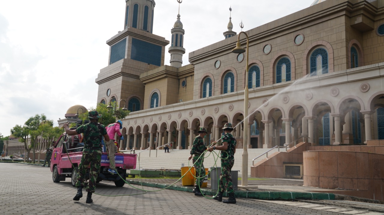 Pasalnya, menurut World Health Organisation (WHO), penyebaran virus adalah lewat droplet yang menepel dipermukaan benda dan lainnya, yang kerap digunakan manusia. Saat awal merebak, tempat ibadah sempat tak diperkenankan untuk didatangi masyarakat. tak ingin khusyuk ibadah warga terganggu, Prajurit TNI dari Korem 091/Aji Surya Natakesuma (ASN) hadir menyeprotkan cairan disfektan.