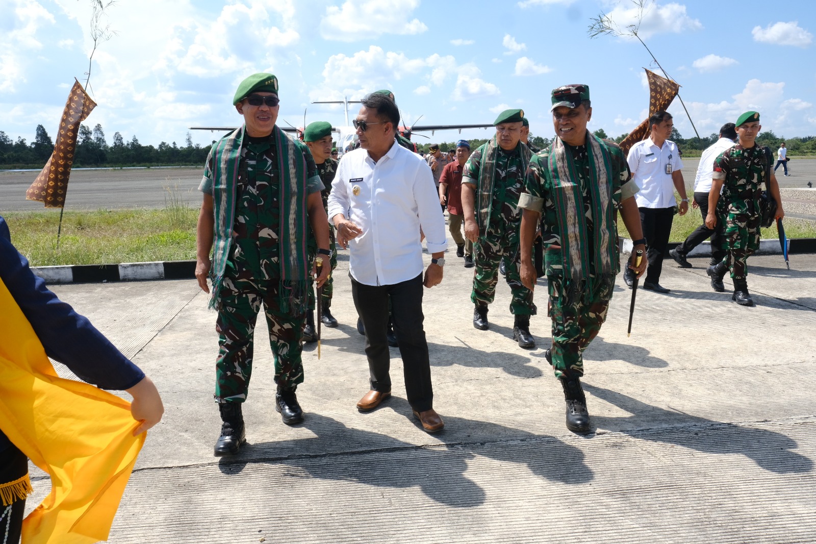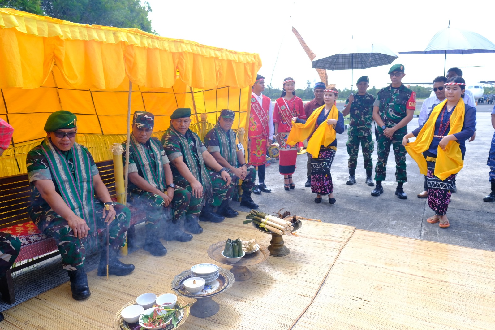 Rombongan Danpusterad di Sambut Oleh H. Nanang Adriani. S. PKP., M.Si. (Wakil Bupati Kab. Kubar), Letkol Inf Doni Fransisco,S. Sos.,M.Han. (Dandim 0912/Kbr), Letkol Inf Syarifuddin Sinaga (Danyon TP 827/Mcy), AKBP Boney Wahyu.W.(Kapolres Kutai Barat), Kapten CPM Salmon (Dansup POM Kubar), Lettu Inf Masrianto (Mewakili Danbrigif), Letda Inf Melky (Pasi Pers Yonif TP 827/Mcy), Kapten Inf Lilik (Danramil 0913-12 Melak), Lettu Arm Dr., Nedi, S.H., M.,Hum (Pasi Intel Kodim 0912/Kbr), Lettu Arm Oktario Sirait, SH (Pasi Op Kodim 0912/Kbr), Letda Lek Rahmadi (Perwakilan Angkatan Udara Kutai Barat),