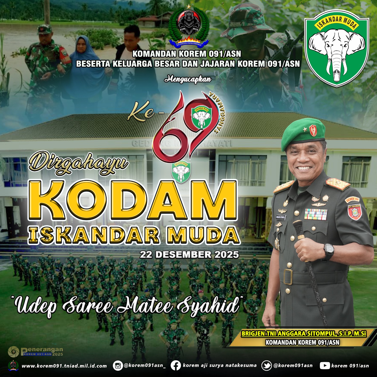 Komandan Korem 091/ASN dan Beserta Keluarga Besar Korem 091/ASN mengucapkan DIRGAHAYU KODAM ISKANDAR MUDA