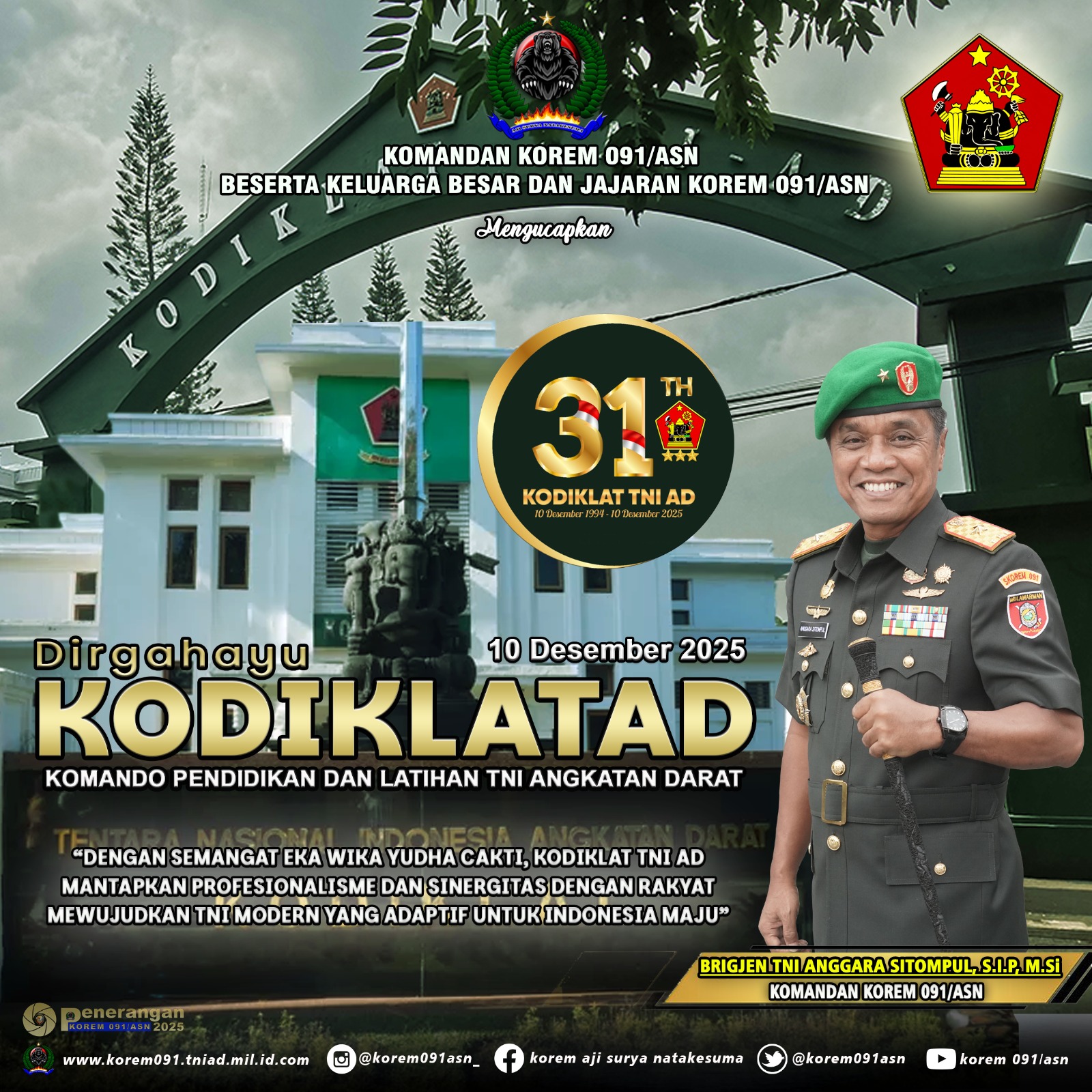 Komandan Korem 091/ASN dan Beserta Keluarga Besar Korem 091/ASN mengucapkan Dirgahayu Kodiklad