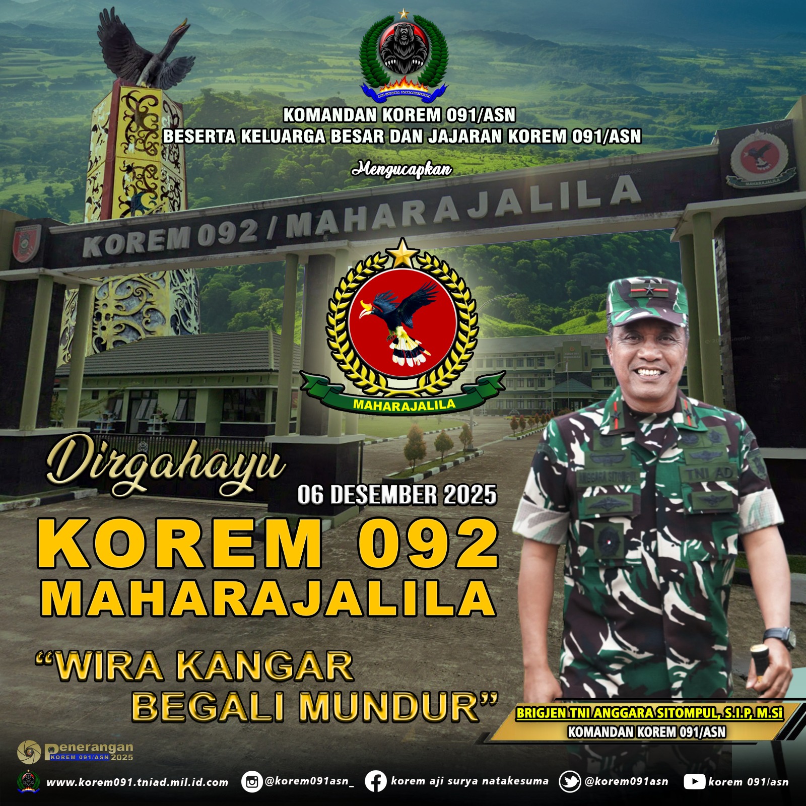 Dirgahayu Korem 092/Maharajalilaadmin0919 Desember 2025Ucapan556 views Komandan Korem 091/ASN dan Beserta Keluarga Besar Korem 091/ASN mengucapkan Dirgahayu Korem 092/Maharajalila 6 Desember 2025 . #tni_angkatan_darat #kodam_mlw #tniprima #profesional #responsif #integratif #modern #adaptif #tniadmengabdidanmembangunbersamarakyat #tentararakyat #infokomando #tniad #korem091asn #bersamarakyattnikuat #prajuritmulawarman Jangan LewatkanSelamat memperingati Isra Mi’raj 1447 H/2026 MDirgahayu PENERANGAN TNI ANGKATAN DARATDirgahayu PROVINSI KALIMANTAN TIMURDirgahayu PUSINTELADDirgahayu DISLITBANG TNI ANGKATAN DARATDirgahayu SECAPA AD