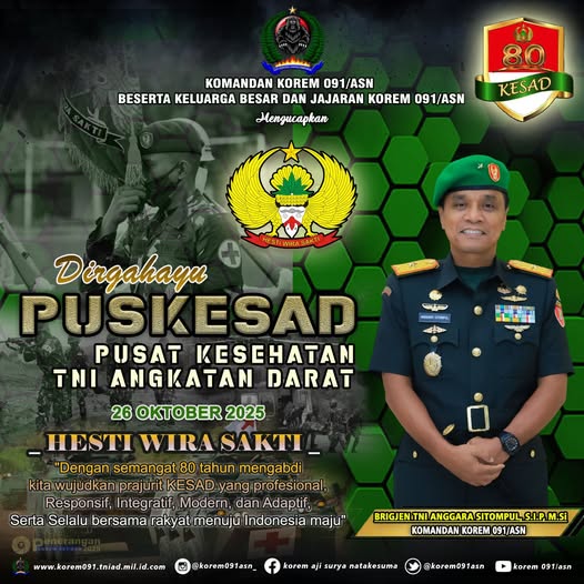 Dirgahayu Korps Kesehatan TNI Angkatan Daratadmin09130 Oktober 2025Berita491 views Komandan Korem 091/ASN dan Beserta Keluarga Besar Korem 091/ASN mengucapkan Dirgahayu Korps Kesehatan TNI Angkatan Darat 26 Oktober 1945 – 26 Oktober 2025 “Hesti Wira Sakti” #TNIAD #KodamVIMulawarman #Korem091Ajisuryanatakesuma Jangan LewatkanDirgahayu Koperasi Kartika TNI Angkatan DaratSelamat & Sukses Atas KENAIKAN PANGKAT Satu Tingkat Lebih Tinggi Perwira, Bintara dan Tamtama Periode 1 April 2026Jembatan Garuda Mulai Dibangun di Pampang, Perkuat Akses dan Konektivitas DesaDirgahayu KOPASKARapat Paripurna Ke 7 DPRD Kaltim Masa Sidang 2026Danrem 091/ASN Pimpin Apel Pagi dan Halal Bihalal