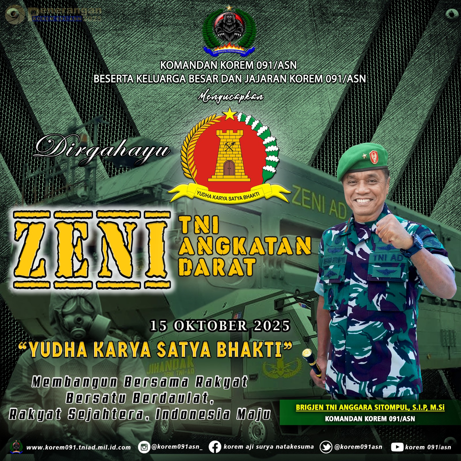 Komandan Korem 091/ASN dan Beserta Keluarga Besar Korem 091/ASN Mengucapkan DIRGAHAYU ZENI TNI Angkatan Darat