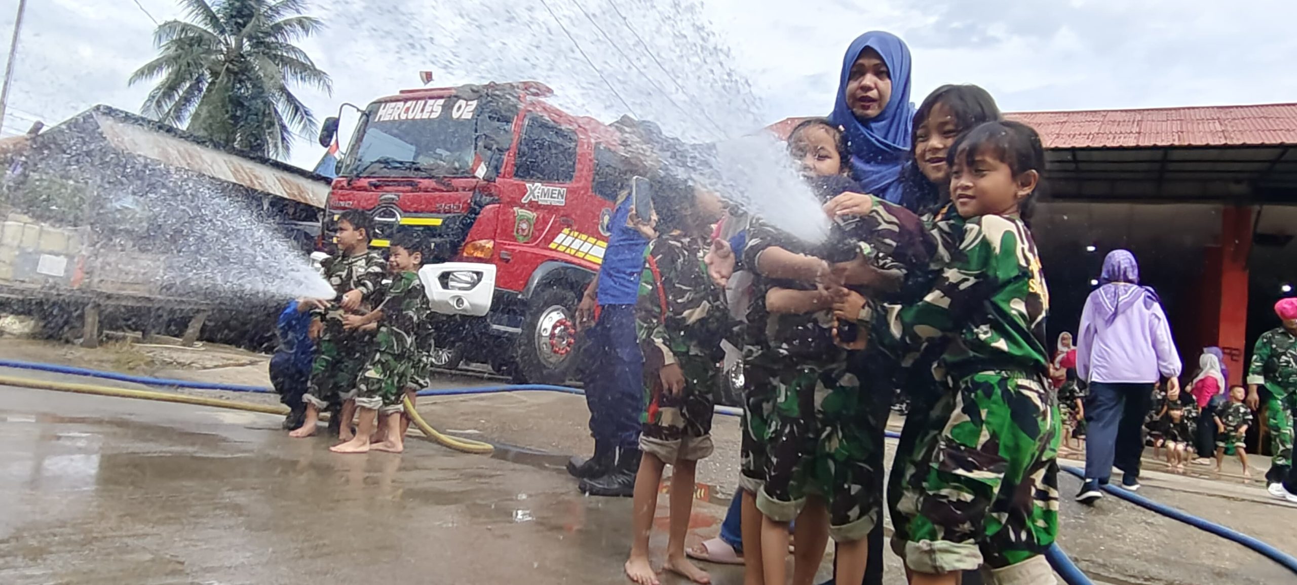Tentu saja mereka senang sekali. Ada juga anak-anak yang diminta untuk membantu memegangkan selangnya. Sungguh menyenangkan.