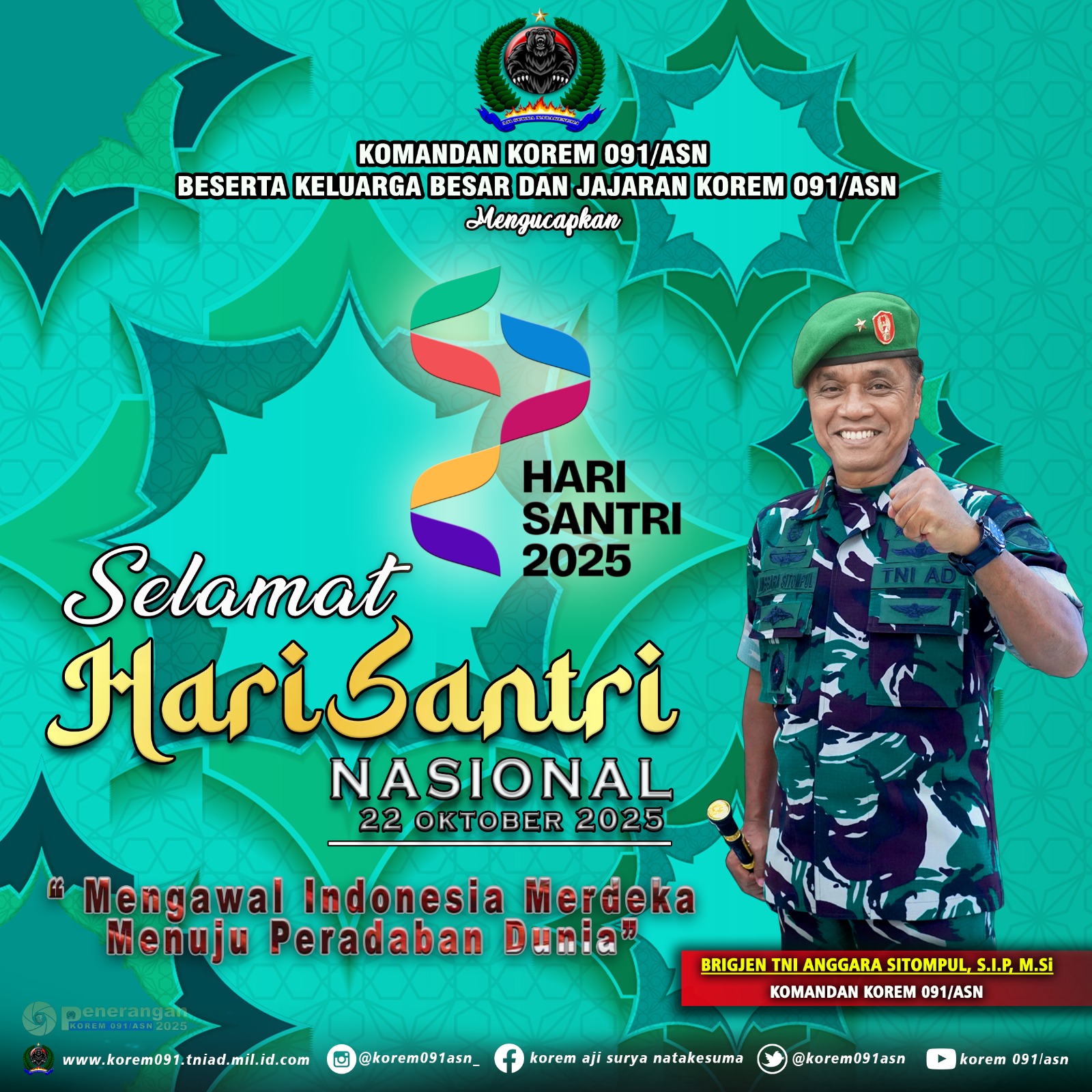 HARI SANTRI NASIONAL 22 Oktober 2025admin09122 Oktober 2025Berita348 views Komandan Korem 091/ASN dan Beserta Keluarga Besar Korem 091/ASN Mengucapkan SELAMAT HARI SANTRI NASIONAL 22 Oktober 2025 . #tni_angkatan_darat #kodam_mlw #tniprima #profesional #responsif #integratif #modern #adaptif #tniadmengabdidanmembangunbersamarakyat #tentararakyat #infokomando #tniad #korem091asn #bersamarakyattnikuat #prajuritmulawarman Jangan LewatkanPeriode 1 April 2026, Danrem 091/ASN Pimpin 135 Prajurit Naik Pangkat Personel Jajaran Korem 091/ASNDirgahayu Koperasi Kartika TNI Angkatan DaratSelamat & Sukses Atas KENAIKAN PANGKAT Satu Tingkat Lebih Tinggi Perwira, Bintara dan Tamtama Periode 1 April 2026Jembatan Garuda Mulai Dibangun di Pampang, Perkuat Akses dan Konektivitas DesaDirgahayu KOPASKARapat Paripurna Ke 7 DPRD Kaltim Masa Sidang 2026