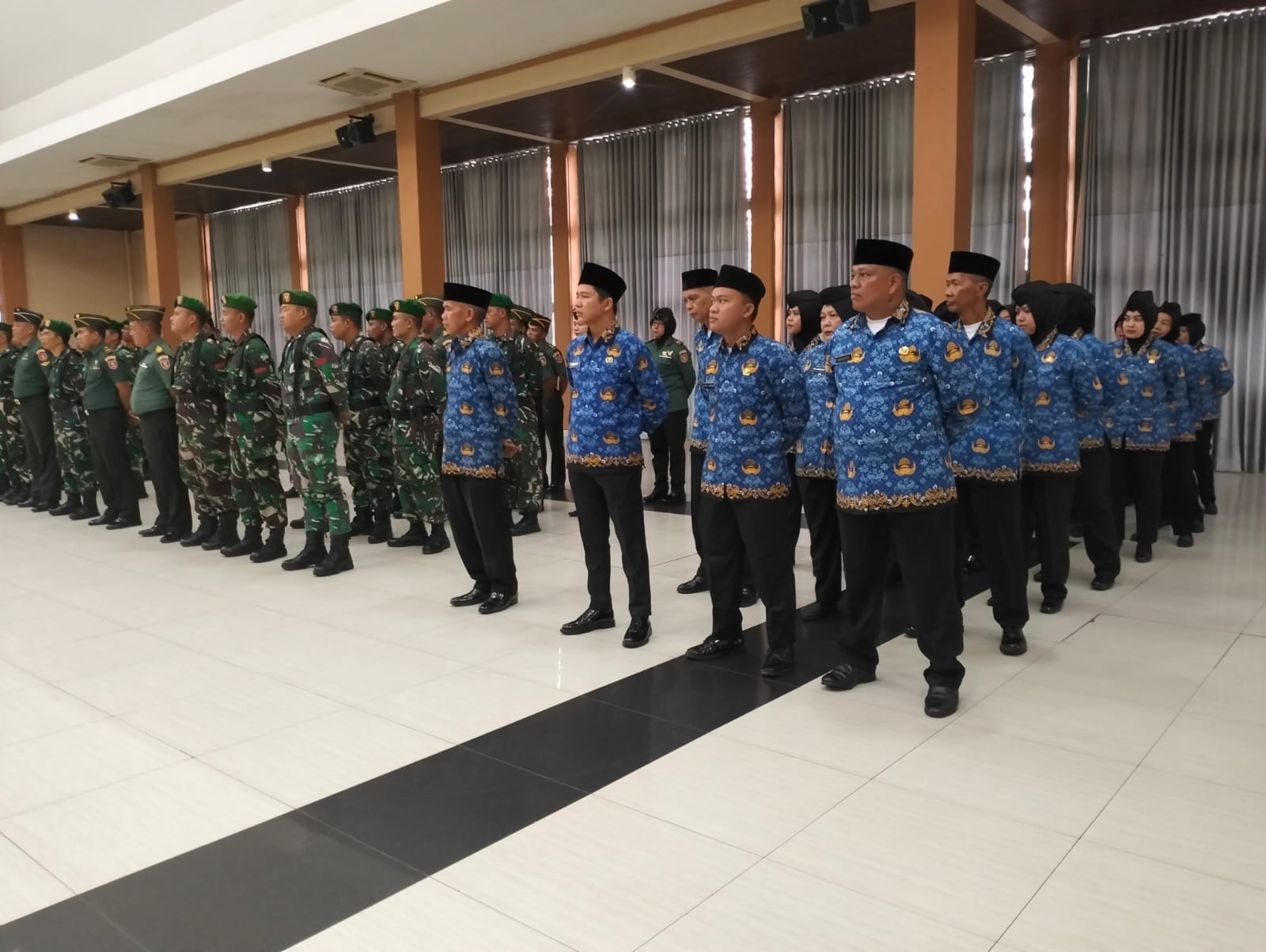 SAMARINDA – Cuaca hujan deras di kota Samarinda, seluruh prajurit dan PNS jajaran Korem 091/Aji Surya Natakesuma (ASN) mengadakan apel pagi sebagai pengganti pelaksanaan Upacara Bendera Memperingati HUT KORPRI Ke-54 Tahun 2025, Senin, (1/12/2025), di aula Wra Yudha Korem 091/ASN Jl. Gajah Mada Samarinda Kaltim.