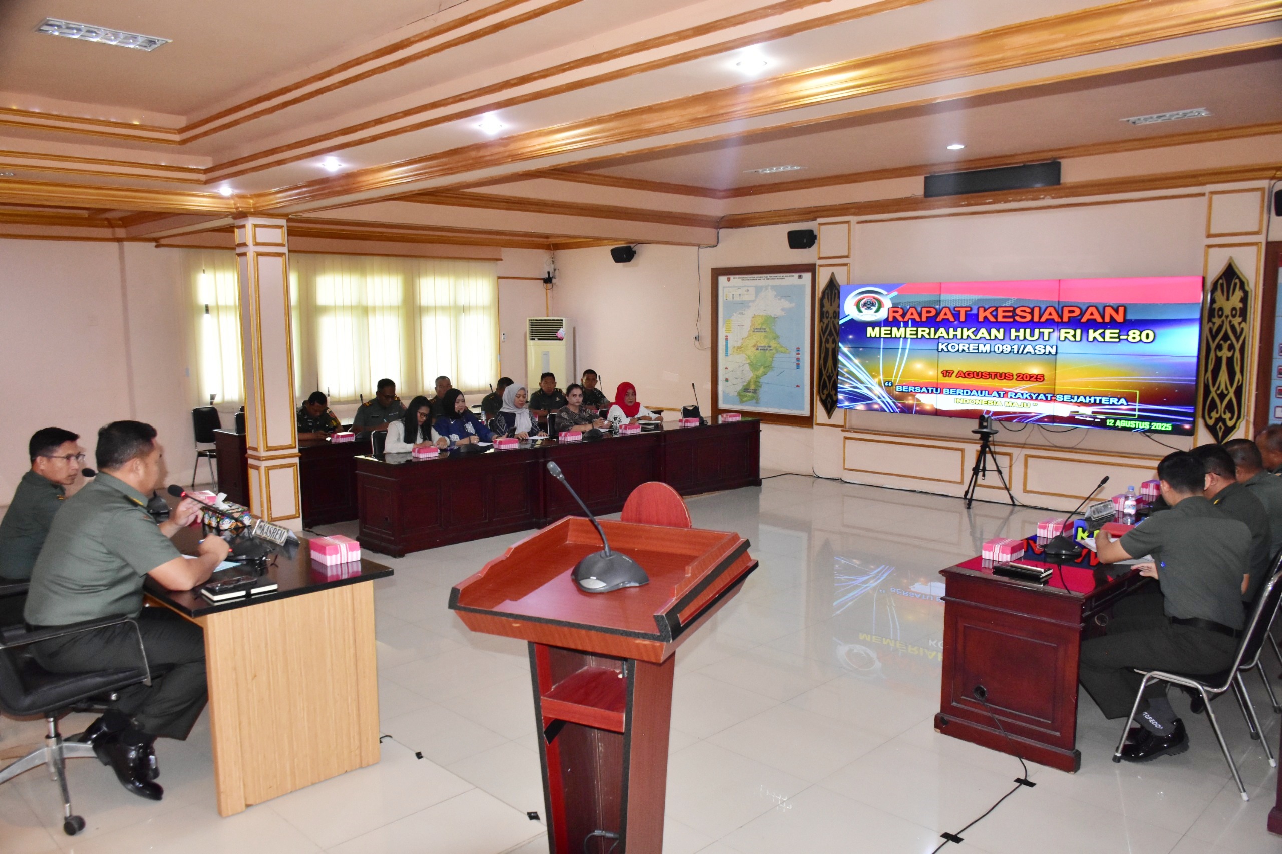 SAMARINDA – Untuk memastikan kesiapan dan suksesnya perayaan Hari Ulang Tahun (HUT) RI ke 80 tanggal 17 Agustus 2025 di KOREM 091/ASN, Kasrem 091/ASN, Kol Kav. Rahyanto Edy Yunianto, S.A.P, , memimpin langsung agenda rapat pertemuan dengan seluruh jajaran Koordinator HUT RI,  bertempat di Ruang Yudha Makorem 091/ASN Jl. Gajah Mada Samarinda. Selasa (12/8/2025).