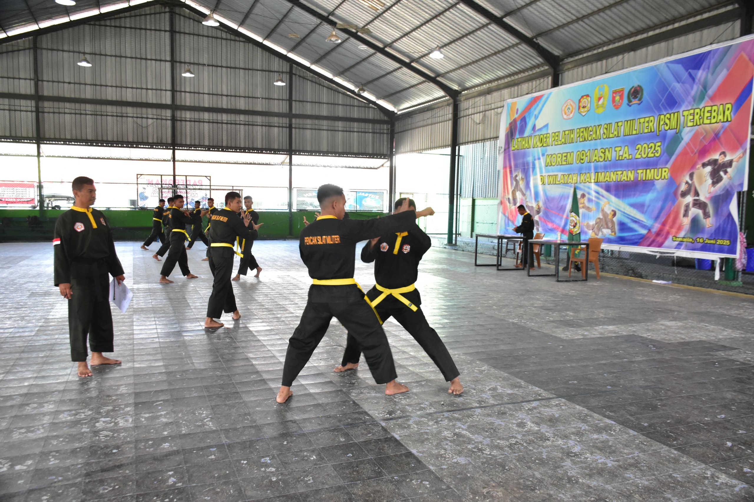 Sebanyak 44 prajurit mengikuti kenaikan tingkat pencak silat militer dari sabuk kuning ke sabuk hijau yang digelar di Sport Center Korem 091/ASN, Jl. Awang Long Samarinda, Kamis (14/8/2025).