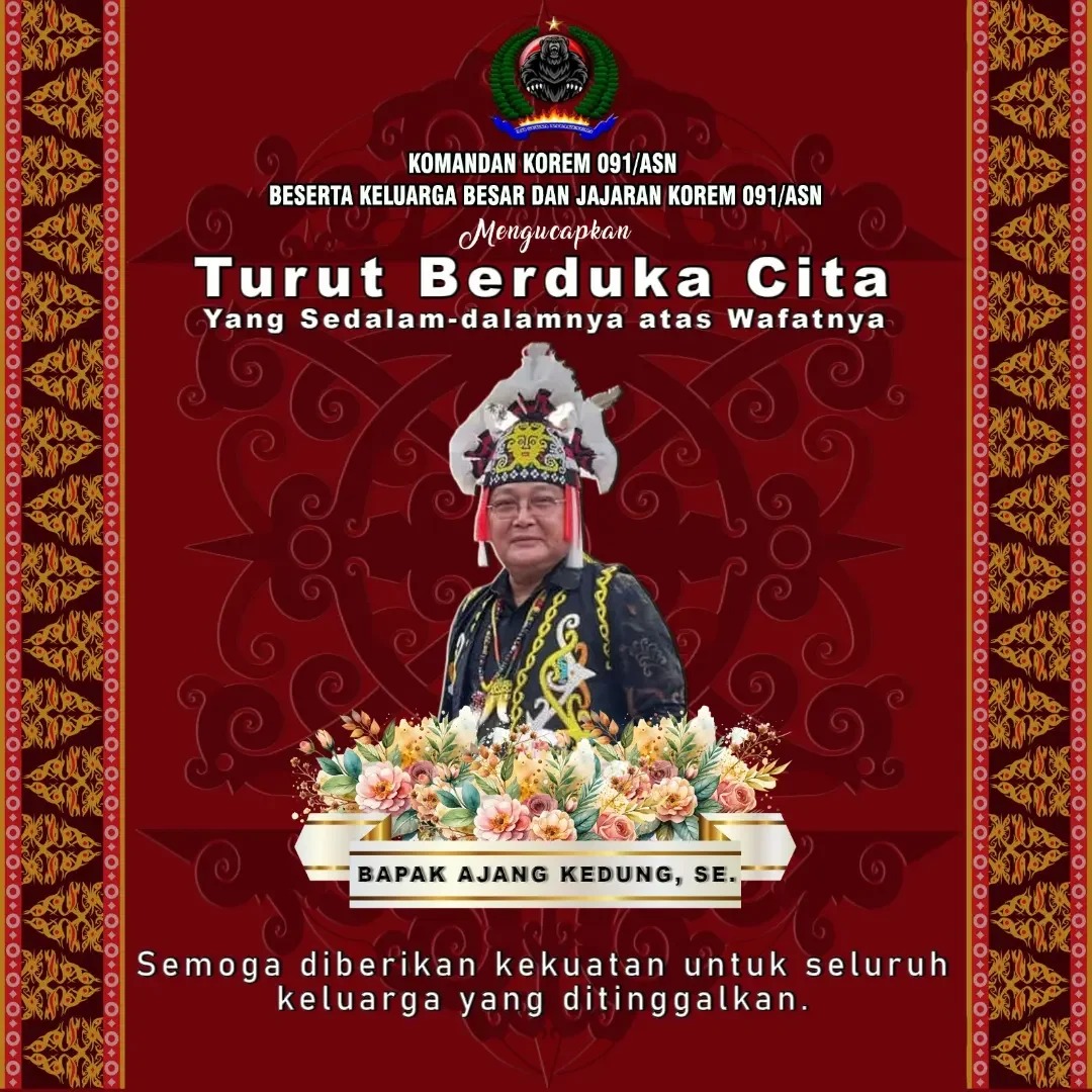 Komandan Korem 091/ASN Beserta Keluarga Besar Korem 091/ASN Mengucapkan Turut Berduka Cita Yang sedalan-dalam atas Wafatnya Kepala Adat Besar Dayak Kenyah Kaltim Bapak Ajang Kedung SE Semoga diberikan kekuatan untuk seluruh keluarga yang ditinggalkan