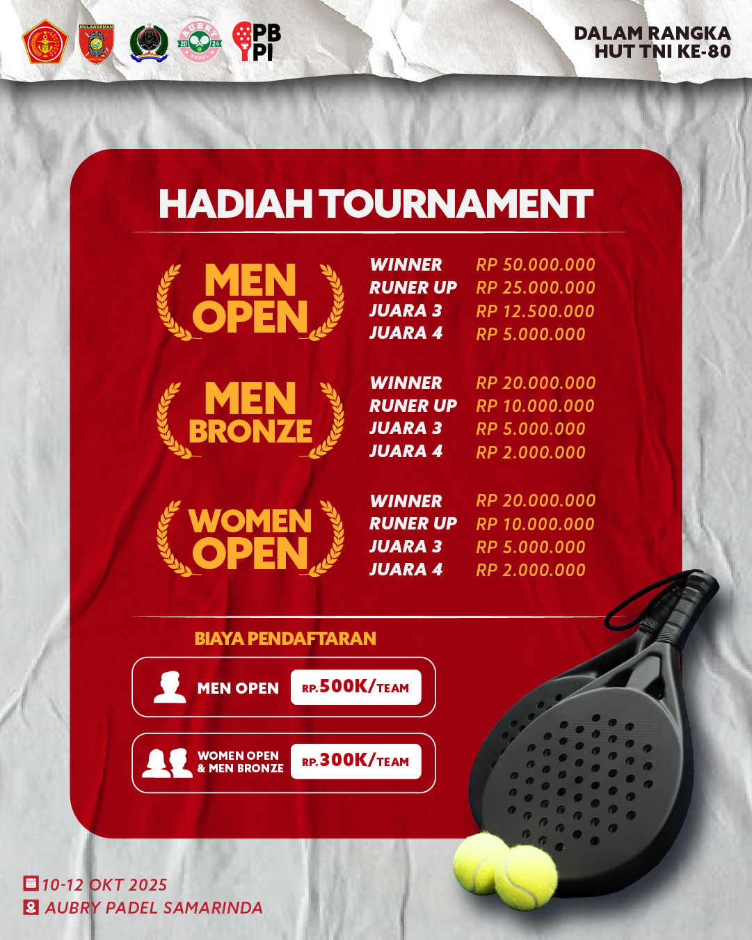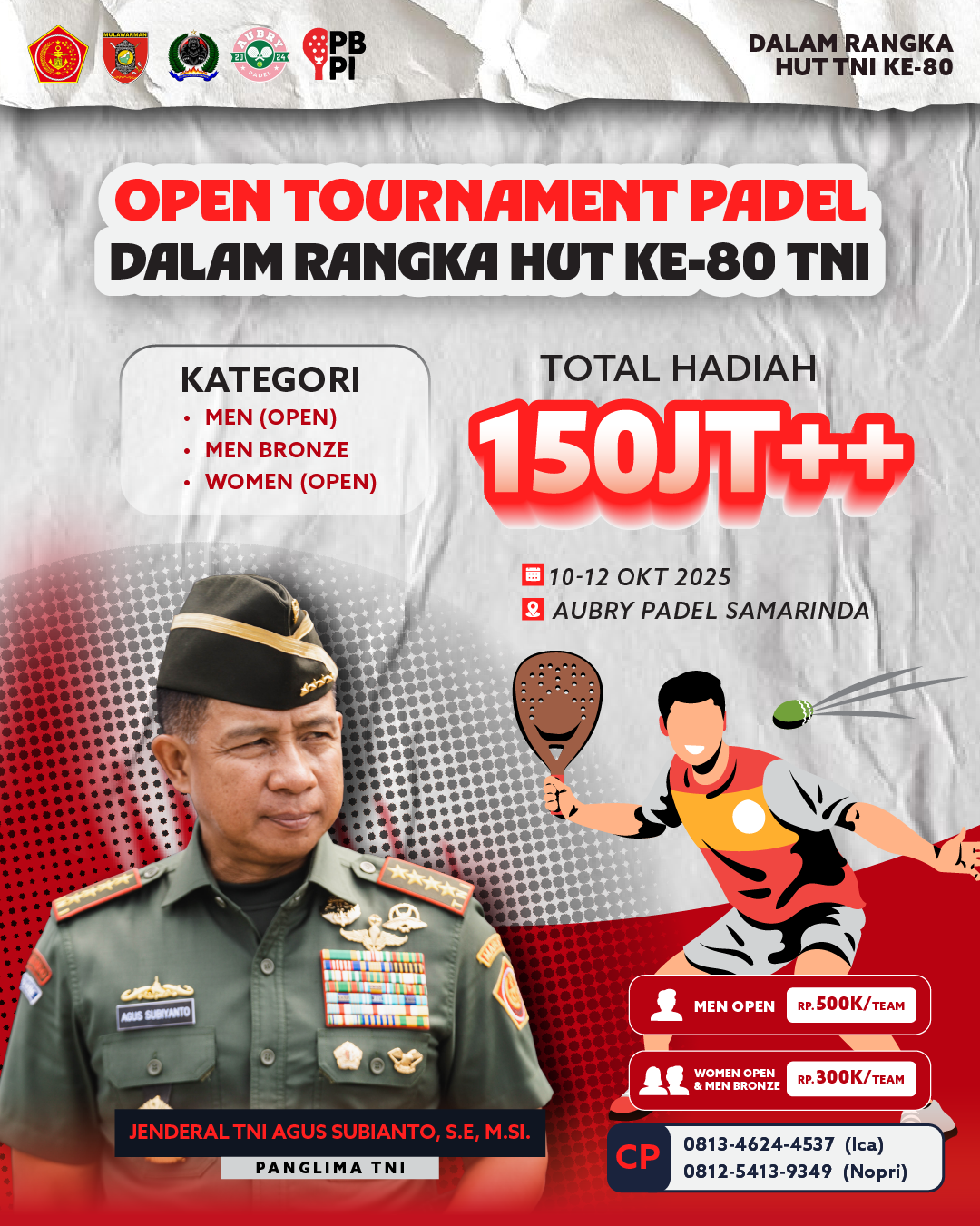 Dalam rangka memperingati Hari Ulang Tahun ke-80 Tentara Nasional Indonesia, ikuti turnamen padel terbesar tahun ini! ??