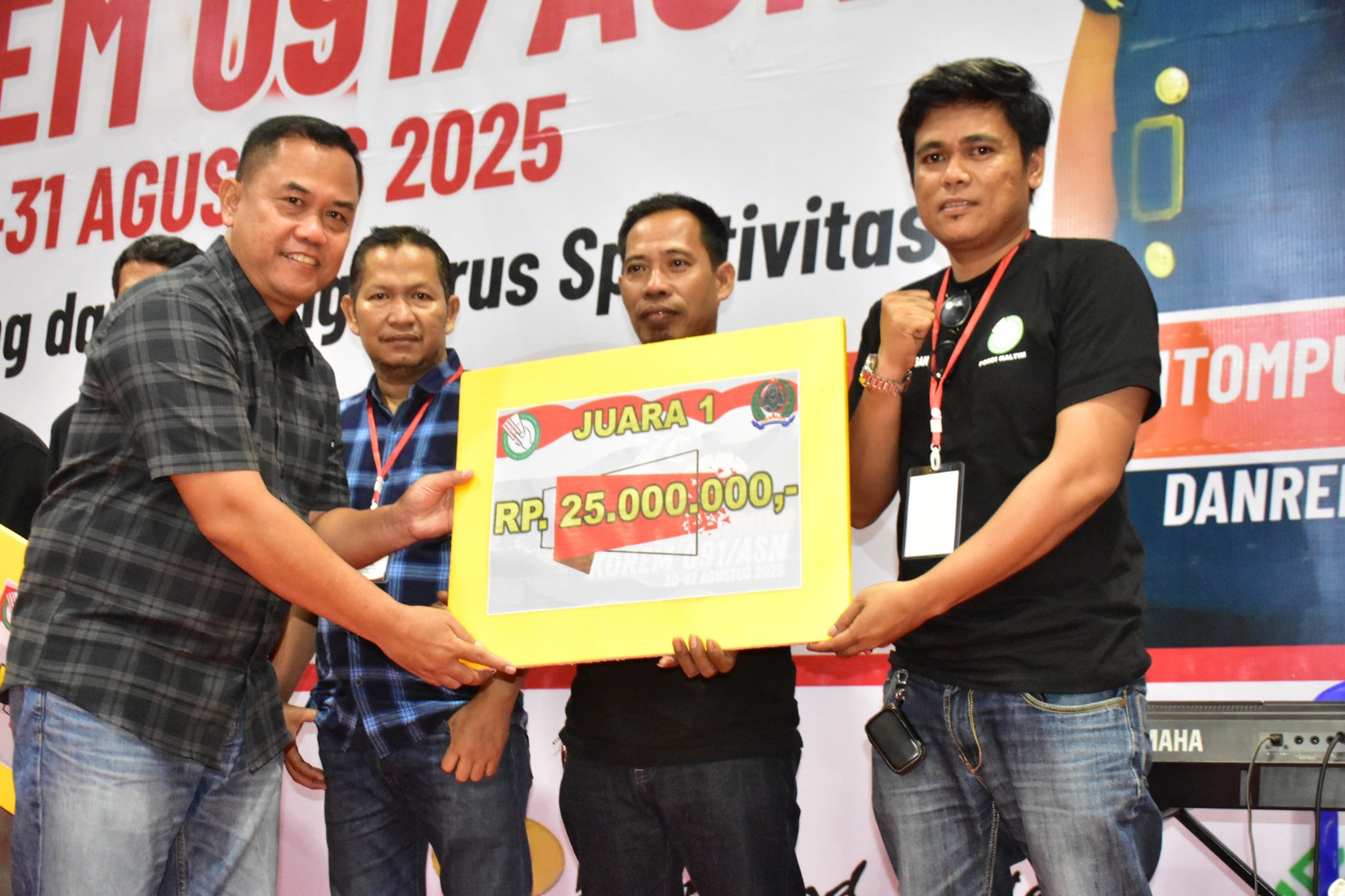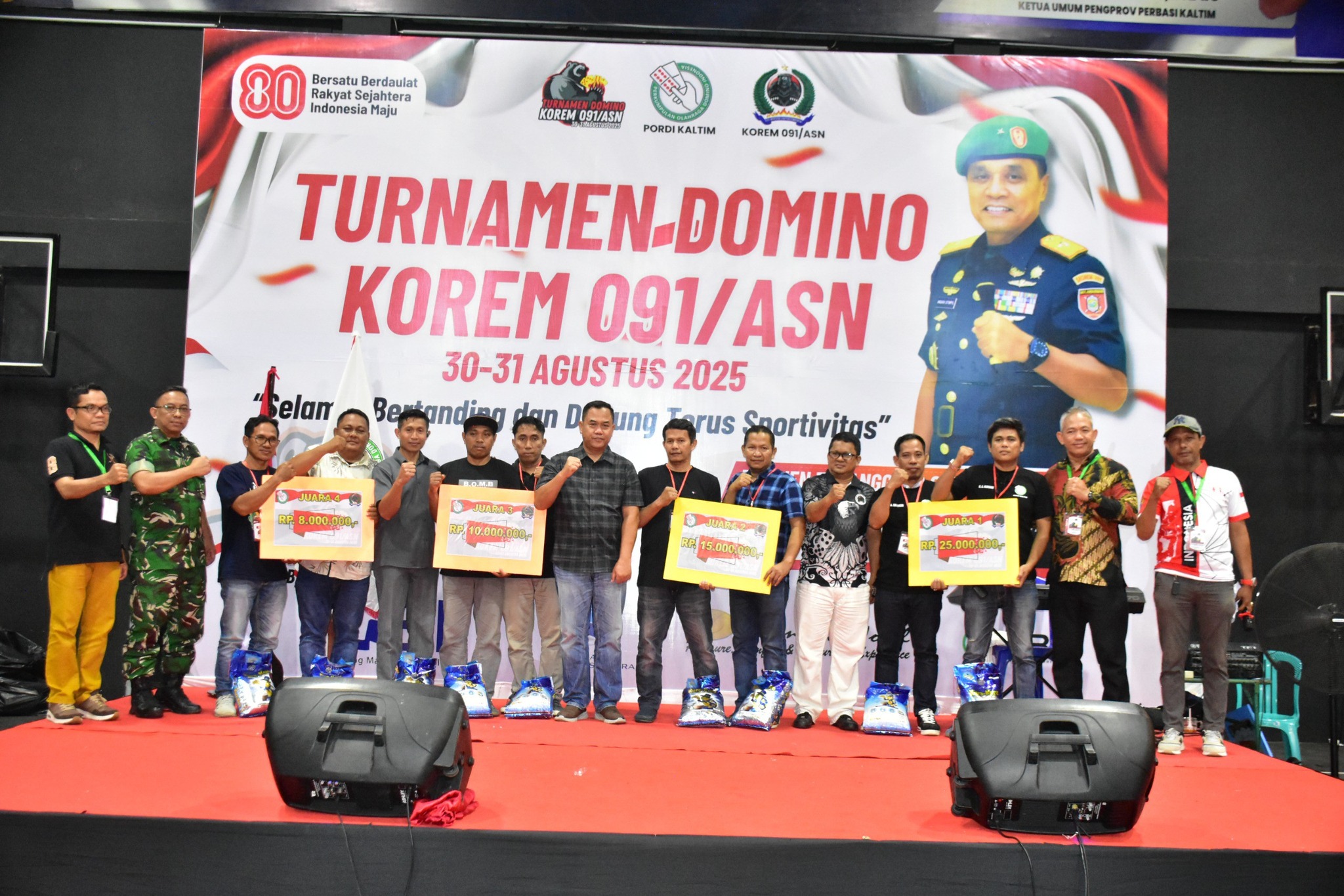 Adapun Para pemenang Turnamen Domino Domino Korem 091/ASN dalam rangka HUT RI Ke – 80 tahun 2025, Juara 1 Mulyar – A Senggeng (Pordi Samarinda Sebrang) dengan uang tunai 25 juta rupiah, Juara 2 Ilyas – Saf (Kodam Balikpapan) dengan uang tunai 15 juta rupiah dan Juara 3 Rudi – Madia (Nusantara DC Samarinda) dengan uang tunai 10 juta rupiah.