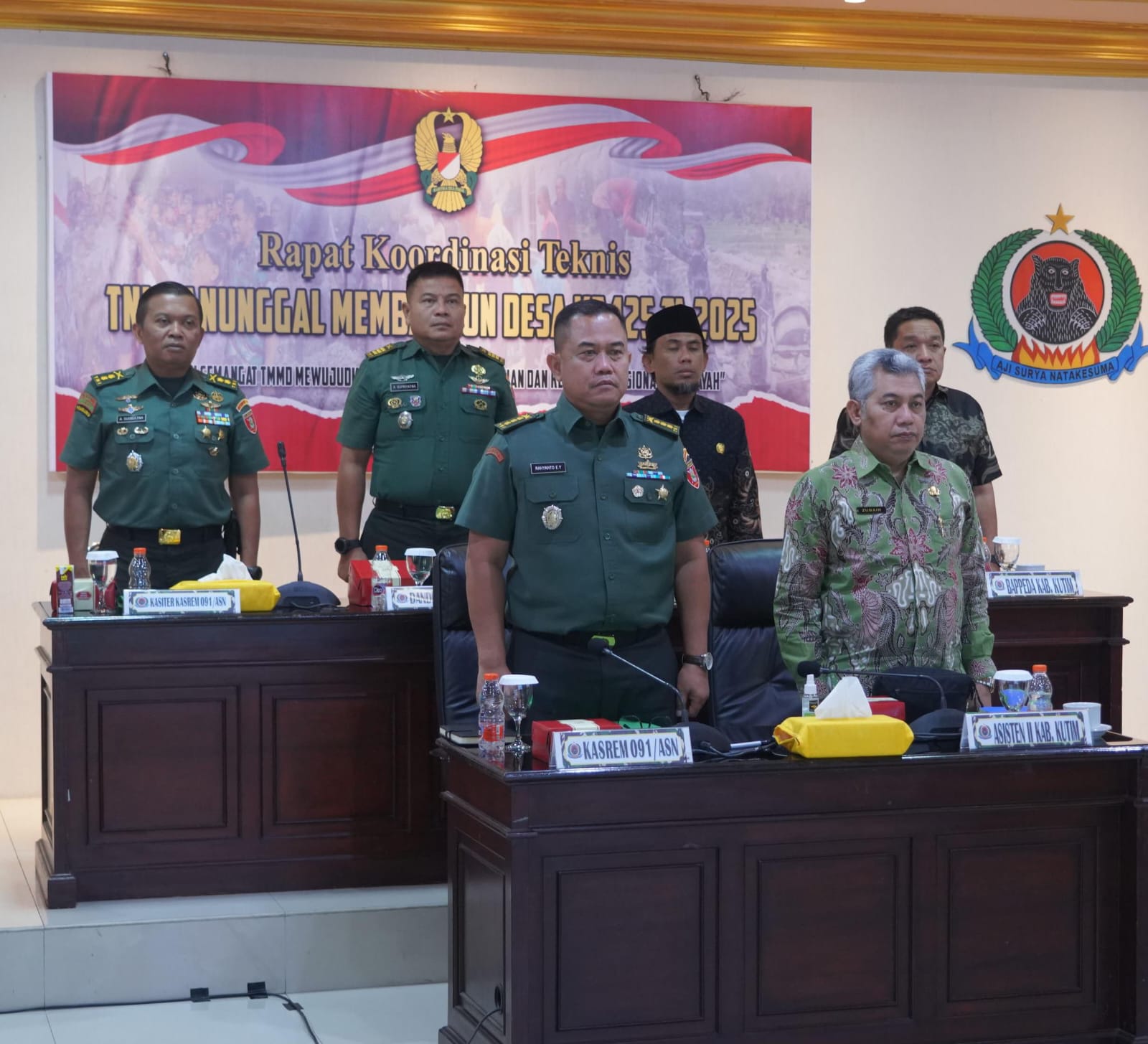 SAMARINDA – Kasrem 091/ASN, Kolonel Kav. Rahyanto Edy Yunianto, S.A.P didampingi Kasi Ter Kasrem 091/ASN, Letkol Inf Aat Supriatna ikuti Rapat Koordinasi Tehnis TNI Manunggal Membangun Desa (TMMD) Ke – 125 TA.2025, bertempat di Ruang Yudha Makorem 091/ASN Jl. Gajah Mada Kota Samarinda, Kamis tanggal 10 Juli 2025.