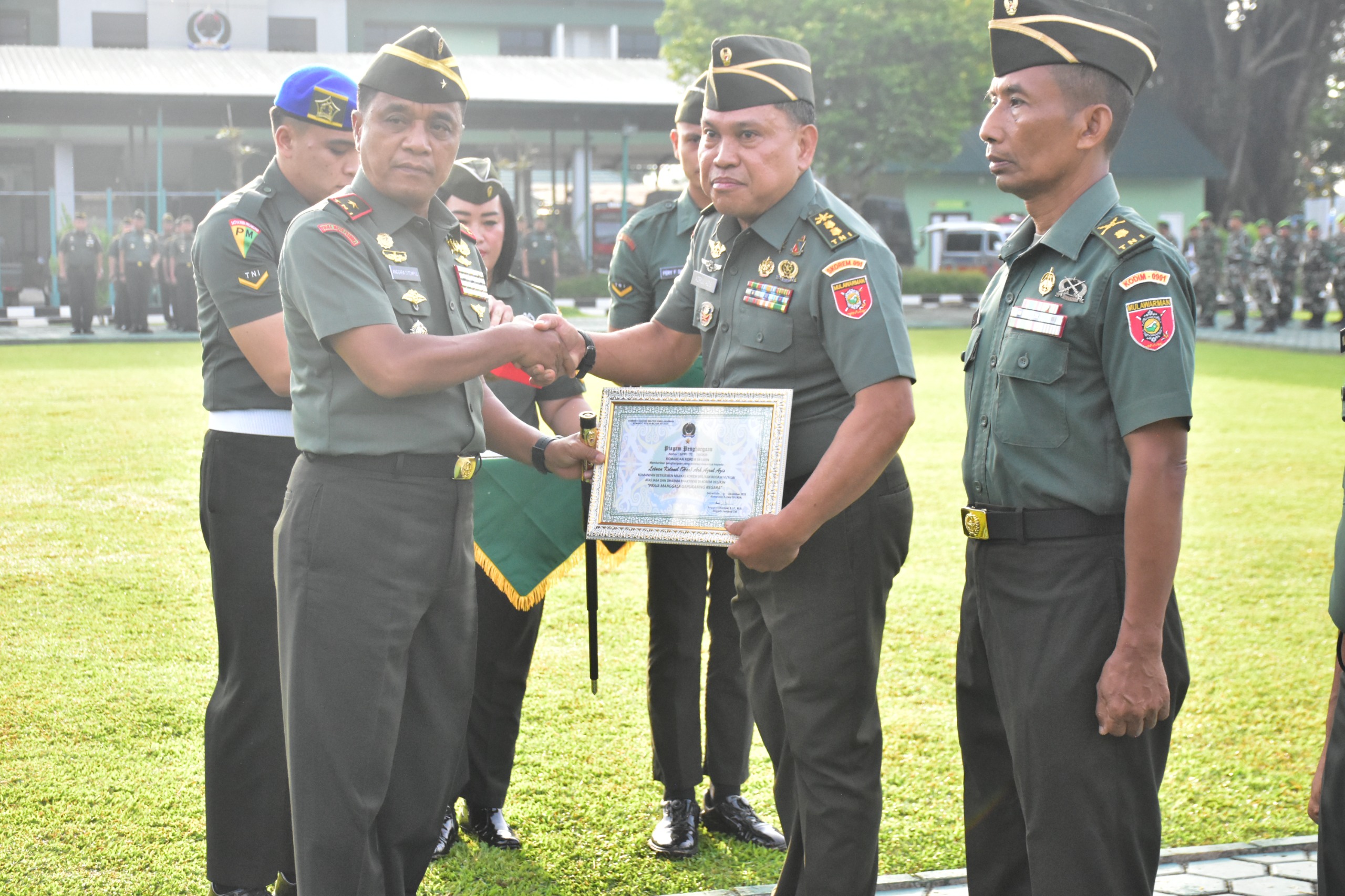 Acara di akhiri dengan pemberian Piagam penghargaan dan Kenang-kenangan berupa Sertifikat kepada Prajurit yang melaksanakan purna tugas.