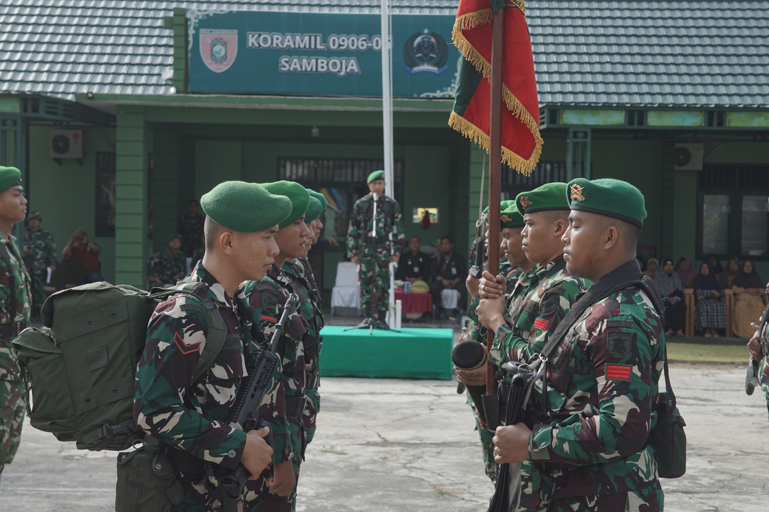 Memperingati hari juang TNI AD ke-77, Kasi Pers Kasrem 091/ASN Kolonel Inf Kusni S.I.P memimpin upacara serah terima penyerahan simbol Yudha Wastu Pramuka jaya (YWPJ) dari Peleton Inti Etape 7 dari Yonif 611/Awl Danton Letda Inf Farhan Sadewa kepada etape 8 Yon TP 827/Mcy Danton Letda Inf Sultan mubarok yang digelar Koramil 0906-06 Samboja Kel. Kmp Lama, Rt.05, Kec. Samboja, Kutai kartanegara. Kamis (18/12/2025).