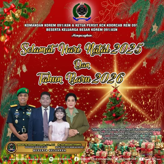 SELAMAT HARI NATAL TAHUN 2025 DAN TAHUN BARU 2026admin09119/01/2026Militer244 Dilihat Komandan Korem 091/ASN dan Beserta Keluarga Besar Korem 091/ASN mengucapkan SELAMAT HARI NATAL TAHUN 2025 DAN TAHUN BARU 2026 25 Desember 2025 . #TNIAD #KodamVIMulawarman #tni_angkatan_darat #tniprima #profesional #responsif #integratif #modern #adaptif #tniadmengabdidanmembangunbersamarakyat #tentararakyat #infokomando #tniad #korem091asn #bersamarakyattnikuat Post Views: 244 Jangan LewatkanPeringatan Isra Mi’raj, Membentuk Karakter Prajurit yang Prima Guna Menuju Indonesia MajuJaksa Agung RI Kunjungi Kalimantan Timur, Disambut Pangdam VI/Mlw dan Danrem 091/ASNPerkuat Konsolidasi, Danrem 091/ASN Apresiasi Semangat Juang Veteran pada HUT ke-69 LVRI KaltimDipimpin Wapang TNI, Danrem 091/ASN Hadiri Vidcon Evaluasi Pembangunan KDKMPWakasad Pimpin Taklimat Awal Penyampaian Program Kerja dan Anggaran (Progjagar) TA 2026Mempererat sinergi dan koordinasi terkait stabilitas ekonomi dan pembangunan daerah, Kepala Perwakilan BI Silaturahmi ke Danrem 091/ASNUpacara Bulanan 17 Januari 2026 dan Pelepasan Purnawirawan Prajurit Korem 091/ASNSelamat memperingati Isra Mi’raj 1447 H/2026 MPelantikan Rektor Untag Samarinda 2026–2029, Danrem 091/ASN Ucapkan SelamatMenteri Pertahanan RI Kunjungi Brigif TP 85/BTC di Kutai BaratDirgahayu PENERANGAN TNI ANGKATAN DARATUpacara Bendera Mingguan Momentum bagi Prajurit Korem 091/ASN untuk Meningkatkan KedisiplinanPrajurit Korem 091/ASN dan Persit Ikuti Nobar Podcast KartikaDanrem 091/ASN Pimpin Apel Gelar Pasukan dalam Rangka Pengamanan VVIP Kunjungan RI 1HUT ke-69 Provinsi Kalimantan Timur, Danrem 091/ASN : Semoga Kaltim menjadi wilayah yang damai, tangguh menghadapi tantangan dan sukses menuju Indonesia Emas 2045Dirgahayu PROVINSI KALIMANTAN TIMURDirgahayu PUSINTELAD Pusat Intelijen TNI Angkatan DaratDirgahayu DISLITBANG TNI ANGKATAN DARATDirgahayu SECAPA ADPanen Raya dan Pengumuman Swasembada Pangan bersama Presiden RI menjadi penanda penting keberhasilan pertanian Indonesia.Awal Tahun 2026, Korem 091/ASN Gelar Upacara Bendera Penuh KhidmatRakerprov, KONI Kaltim Evaluasi Kinerja 2025Memperingati Hari Amal Bakti ke-80 Kementerian Agama RI Kemenag Perkuat SilaturahmiDanrem 091/ASN : Mengapresiasi Peran Wahdah Islamiyah KaltimKorem 091/ASN Gelar Doa Bersama Lintas Agama Sambut Tahun Baru 2026 dan Doakan Korban Bencana AlamKeluarga Besar Korem 091/ASN Sambut Pergantian Tahun Baru 2026 Secara SederhanaDanrem 091/ASN : Apresiasi Atas Upaya Memperkuat Stabilitas Dan Kemandirian Ekonomi Melalui Sektor Syariah.Korem 091/ASN Gelar Doa Bersama Lintas Agama Sambut Tahun Baru 2026 dan Doakan Korban Bencana Alam