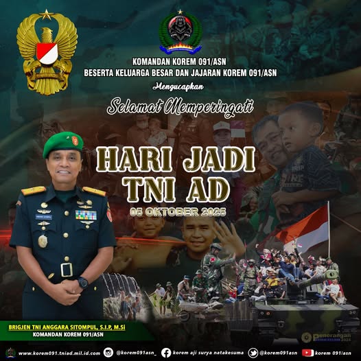 Selamat MEMPERINGATI HARI JADI TNI ADadmin09109/01/2026Militer186 Dilihat Komandan Korem 091/ASN dan Beserta Keluarga Besar Korem 091/ASN Mengucapkan Selamat MEMPERINGATI HARI JADI TNI AD 5 Oktober 2025 . . #tni_angkatan_darat #kodam_mlw #tniprima #profesional #responsif #integratif #modern #adaptif #tniadmengabdidanmembangunbersamarakyat #tentararakyat #infokomando #tniad #korem091asn #bersamarakyattnikuat #prajuritmulawarman Post Views: 186 Jangan LewatkanPeringatan Isra Mi’raj, Membentuk Karakter Prajurit yang Prima Guna Menuju Indonesia MajuJaksa Agung RI Kunjungi Kalimantan Timur, Disambut Pangdam VI/Mlw dan Danrem 091/ASNPerkuat Konsolidasi, Danrem 091/ASN Apresiasi Semangat Juang Veteran pada HUT ke-69 LVRI KaltimDipimpin Wapang TNI, Danrem 091/ASN Hadiri Vidcon Evaluasi Pembangunan KDKMPWakasad Pimpin Taklimat Awal Penyampaian Program Kerja dan Anggaran (Progjagar) TA 2026Mempererat sinergi dan koordinasi terkait stabilitas ekonomi dan pembangunan daerah, Kepala Perwakilan BI Silaturahmi ke Danrem 091/ASNUpacara Bulanan 17 Januari 2026 dan Pelepasan Purnawirawan Prajurit Korem 091/ASNSelamat memperingati Isra Mi’raj 1447 H/2026 MPelantikan Rektor Untag Samarinda 2026–2029, Danrem 091/ASN Ucapkan SelamatMenteri Pertahanan RI Kunjungi Brigif TP 85/BTC di Kutai BaratDirgahayu PENERANGAN TNI ANGKATAN DARATUpacara Bendera Mingguan Momentum bagi Prajurit Korem 091/ASN untuk Meningkatkan KedisiplinanPrajurit Korem 091/ASN dan Persit Ikuti Nobar Podcast KartikaDanrem 091/ASN Pimpin Apel Gelar Pasukan dalam Rangka Pengamanan VVIP Kunjungan RI 1HUT ke-69 Provinsi Kalimantan Timur, Danrem 091/ASN : Semoga Kaltim menjadi wilayah yang damai, tangguh menghadapi tantangan dan sukses menuju Indonesia Emas 2045Dirgahayu PROVINSI KALIMANTAN TIMURDirgahayu PUSINTELAD Pusat Intelijen TNI Angkatan DaratDirgahayu DISLITBANG TNI ANGKATAN DARATDirgahayu SECAPA ADPanen Raya dan Pengumuman Swasembada Pangan bersama Presiden RI menjadi penanda penting keberhasilan pertanian Indonesia.Awal Tahun 2026, Korem 091/ASN Gelar Upacara Bendera Penuh KhidmatRakerprov, KONI Kaltim Evaluasi Kinerja 2025Memperingati Hari Amal Bakti ke-80 Kementerian Agama RI Kemenag Perkuat SilaturahmiDanrem 091/ASN : Mengapresiasi Peran Wahdah Islamiyah KaltimKorem 091/ASN Gelar Doa Bersama Lintas Agama Sambut Tahun Baru 2026 dan Doakan Korban Bencana AlamKeluarga Besar Korem 091/ASN Sambut Pergantian Tahun Baru 2026 Secara SederhanaDanrem 091/ASN : Apresiasi Atas Upaya Memperkuat Stabilitas Dan Kemandirian Ekonomi Melalui Sektor Syariah.Korem 091/ASN Gelar Doa Bersama Lintas Agama Sambut Tahun Baru 2026 dan Doakan Korban Bencana Alam