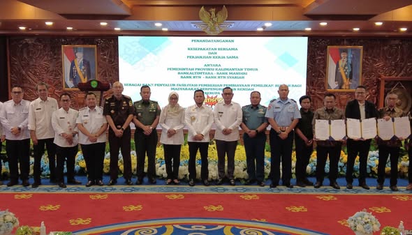 Kegiatan penandatanganan Penandatanganan Kesepakatan Bersama dan Perjanjian Kerja Sama antara Pemprov Kaltim, Bank Kaltim Tara, Bank Mandiri, Bank BTN, Bank Syariah sebagai Bank Penyalur Fasilitasi Pemberian Pembiayaan Pemilikan Rumah Bagi Masyarakat Berpenghasilan Rendah Berupa Gratispoll biaya administrasi Perumahan dilaksanakan di Ruang Ruhui Rahayu Kantor Gubernur Kaltim Jln. Gajah Mada, Kel. Jawa, kec. Samarinda Ulu, Kota Samarinda. Rabu (20/8/2025).