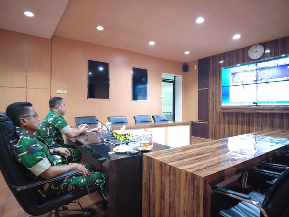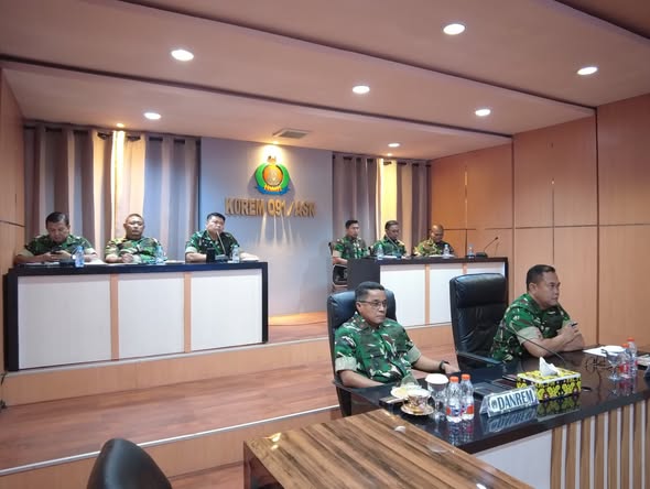 Danrem 091/ASN Brigjen TNI Anggara Sitompul, S.I.P., M.Si.,Kasrem 091/ASN Kolonel. Kav. Rahyanto Edy Yuniarto S.A.P. dan Para Kasi Kasrem 091/ASN hadiri Taklimat Awal Audit Kinerja Itjenad di Kodam VI/Mlw secara Vicon, di Ruang Commad Center Makorem 091/ASN. Jln. Gajah Mada, No.2, RW. 01, Kel. Jawa, Kec. Samarinda Ulu, Kota Samarinda, Prov. Kaltim, Selasa (14/10/2025).